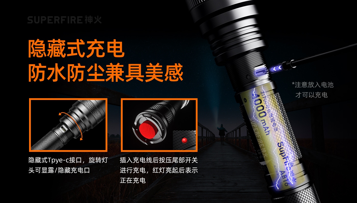 4、多样化充电,使用方便;设有Type-C充电接口,可使用充电器、充电宝、电脑等设备为手电充电。隐藏式充电口,防水性能好。