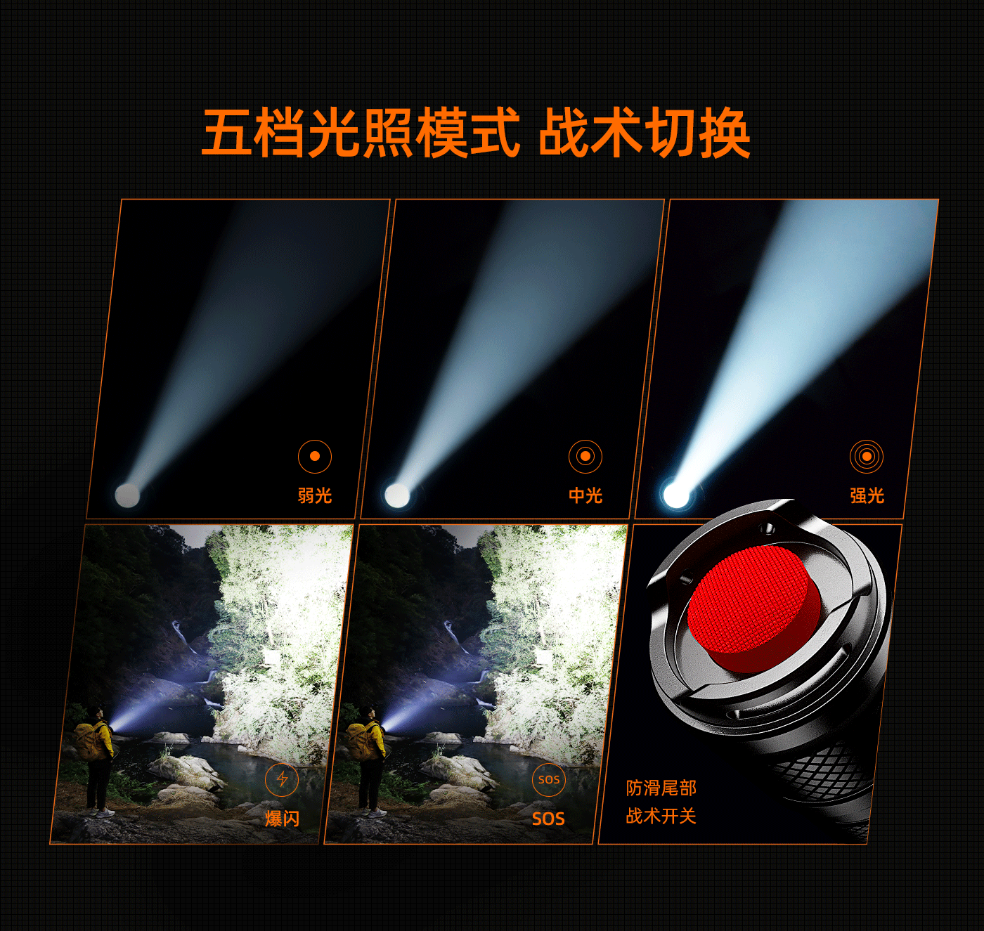 聚光主灯 亮度随心 轻按后端开关按钮,主灯强光点亮,续按依次切换主灯工作光-爆闪光。主灯开启状态下长按5秒,可实现光源色温转换。主灯关闭状态下长按5秒,可开启灯具最亮照明模式。 爆亮强光 亮如白昼 1500LM大功率高亮光源,点亮顷刻如白昼