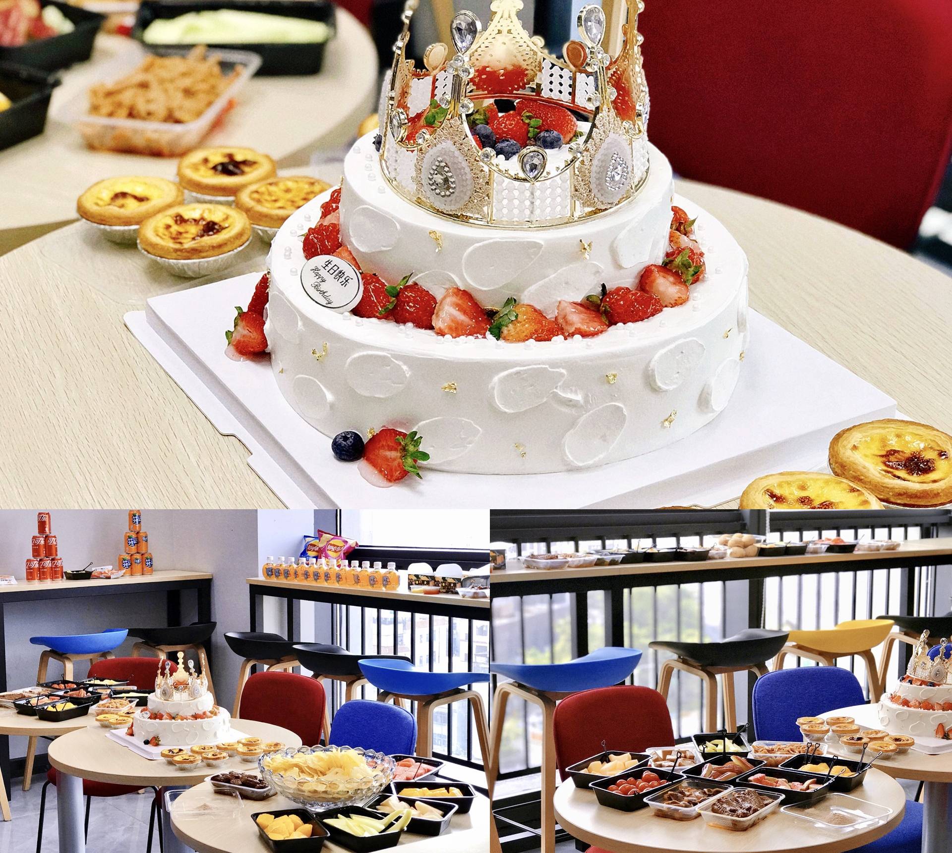 公司为员工准备了蛋糕、甜点、零食、水果、饮品等,并通过轻松欢快的音乐、破冰游戏、生日歌、切蛋糕仪式、共享美食等环节,为生日的小伙伴们营造愉悦温暖的氛围。