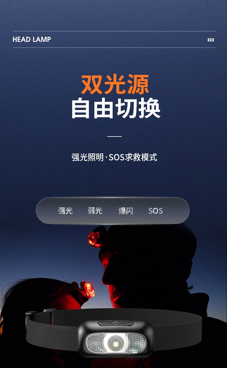 强光亮度,运动头灯,前后均衡设计,轻便不压头,可调节式头灯带,佩戴方便舒适,伸缩调焦,光照范围大,照射距离远,头灯角度调节,超90度角度随意调节,适宜各种环境使用