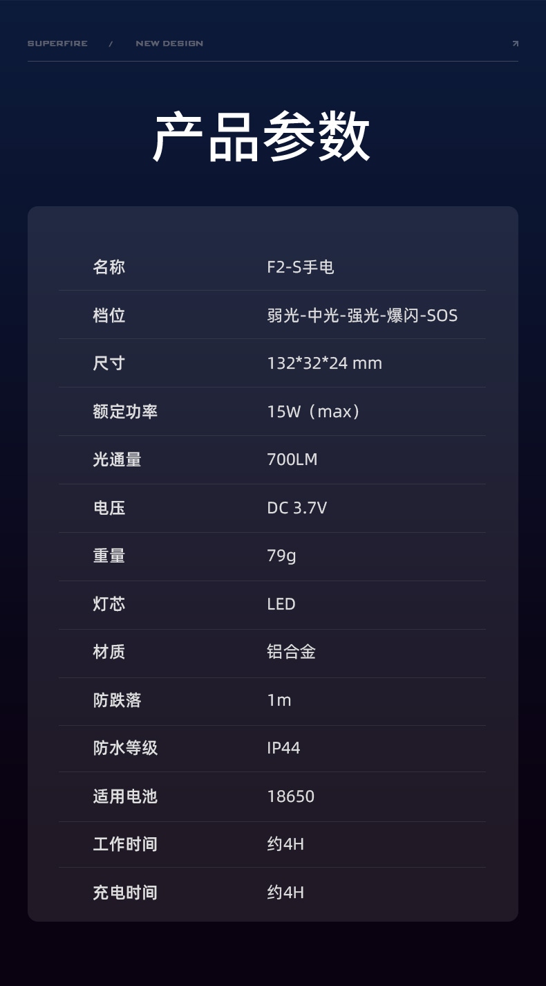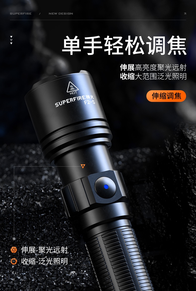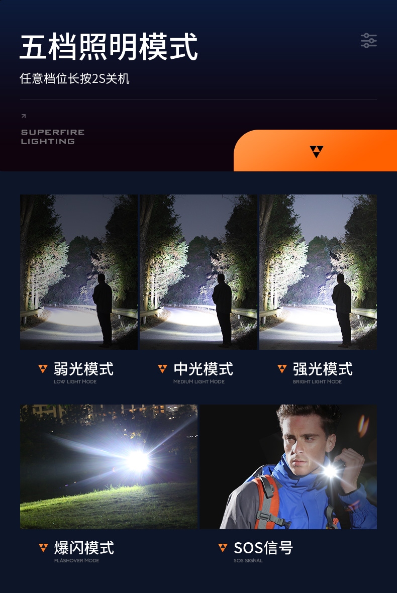 1、多档调光、可满足不同场景下的使用需求。 2、伸缩调焦、聚泛随心。