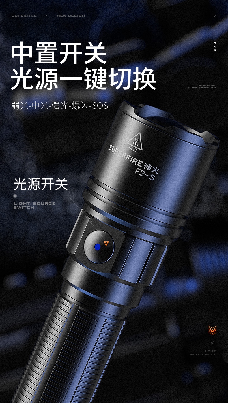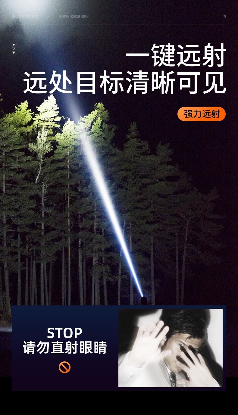 1、千米远射,射程更远,光斑更聚焦。 2、进口灯珠,亮度高,照明效果更好。 3、前后双按键,光源一键点亮,高亮瞬间开启。