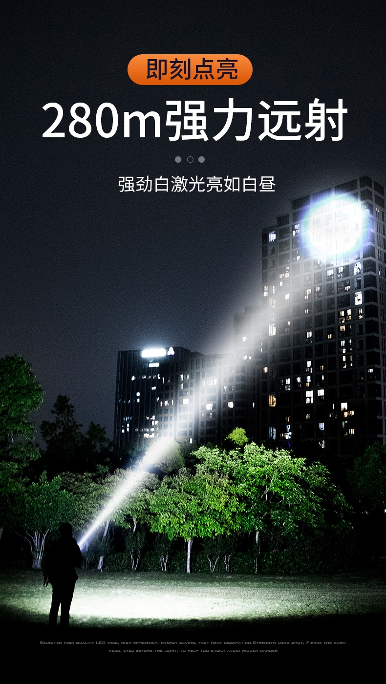 1、千米远射,射程更远,光斑更聚焦。 2、进口灯珠,亮度高,照明效果更好。 3、前后双按键,光源一键点亮,高亮瞬间开启。
