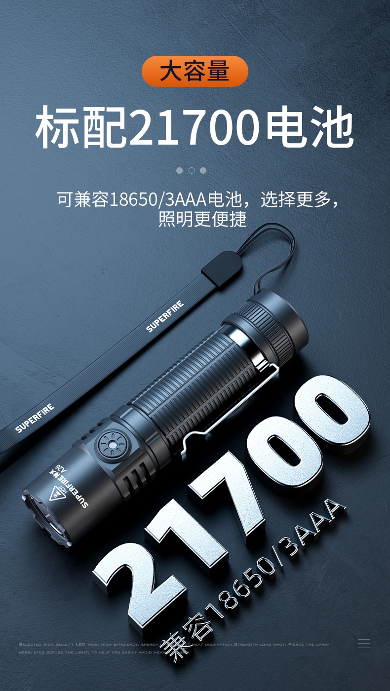 10、兼容18650/21700/3AAA电池,多种电池兼容,可随时换电池使用。