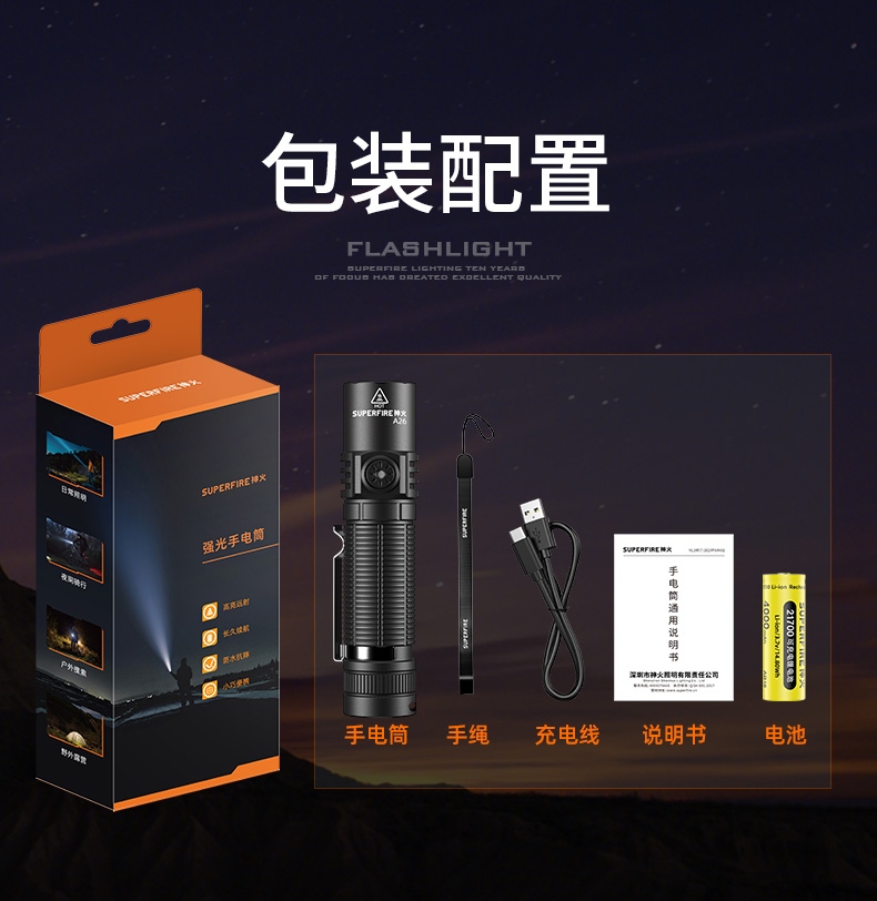 四档调光 Type-C充电 电量显示 铝合金筒身 持久续航 强力防水