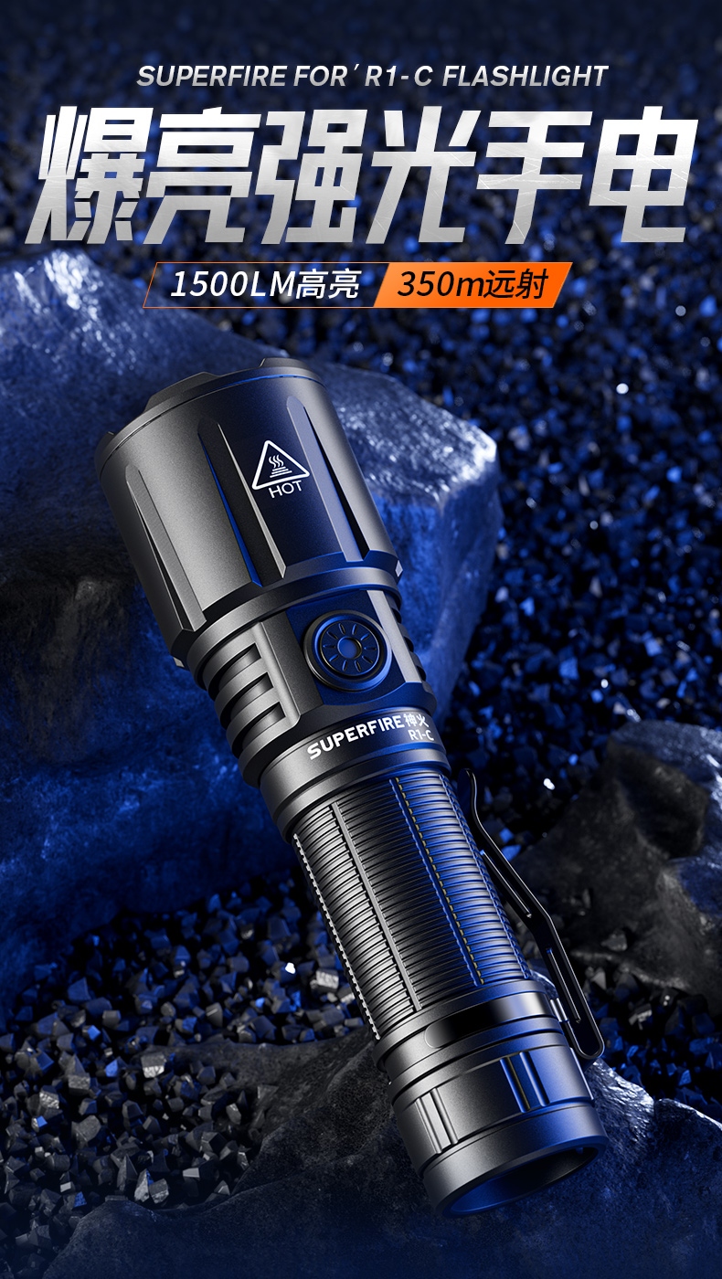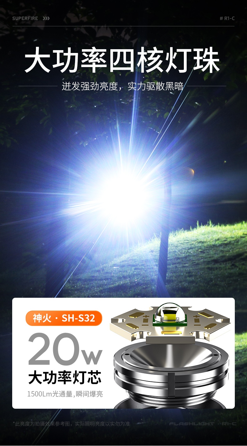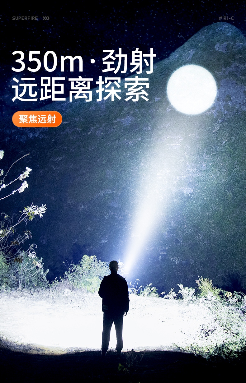 1、千米远射,射程更远,光斑更聚焦。 2、进口灯珠,亮度高,照明效果更好。 3、前后双按键,光源一键点亮,高亮瞬间开启。