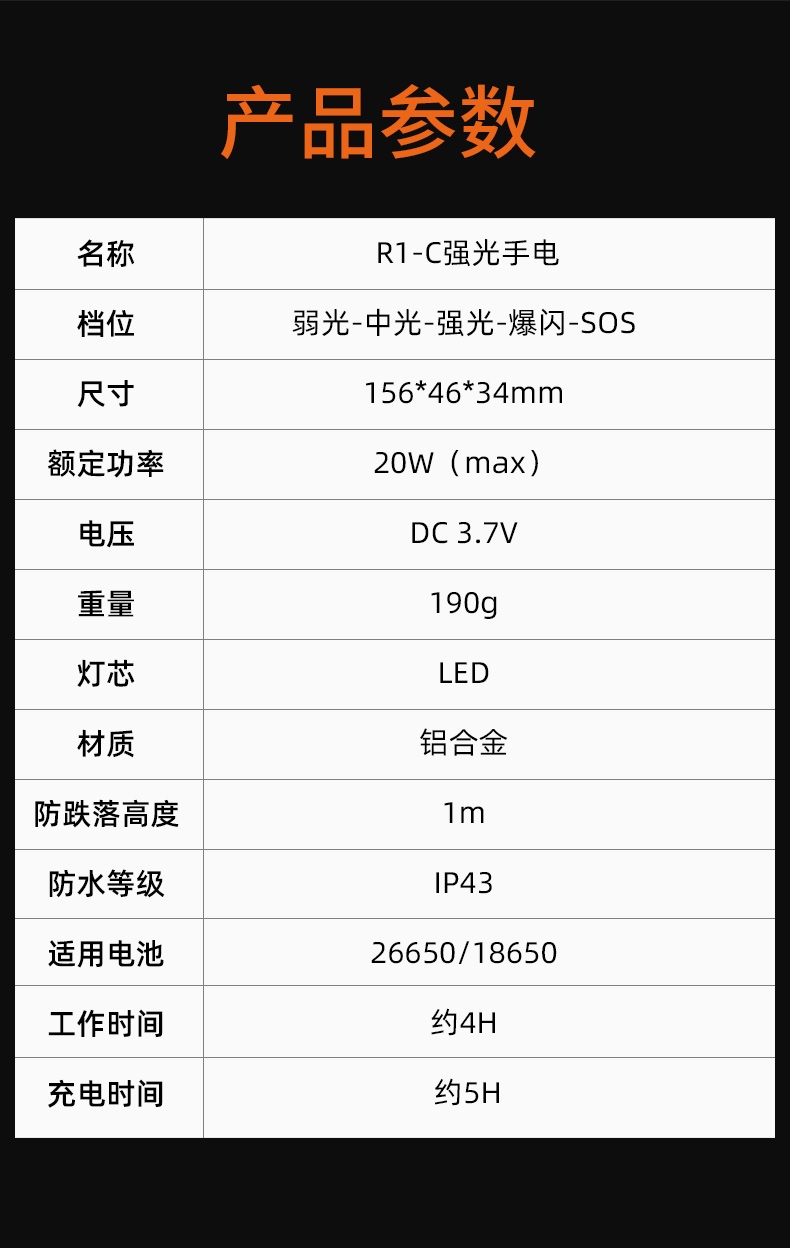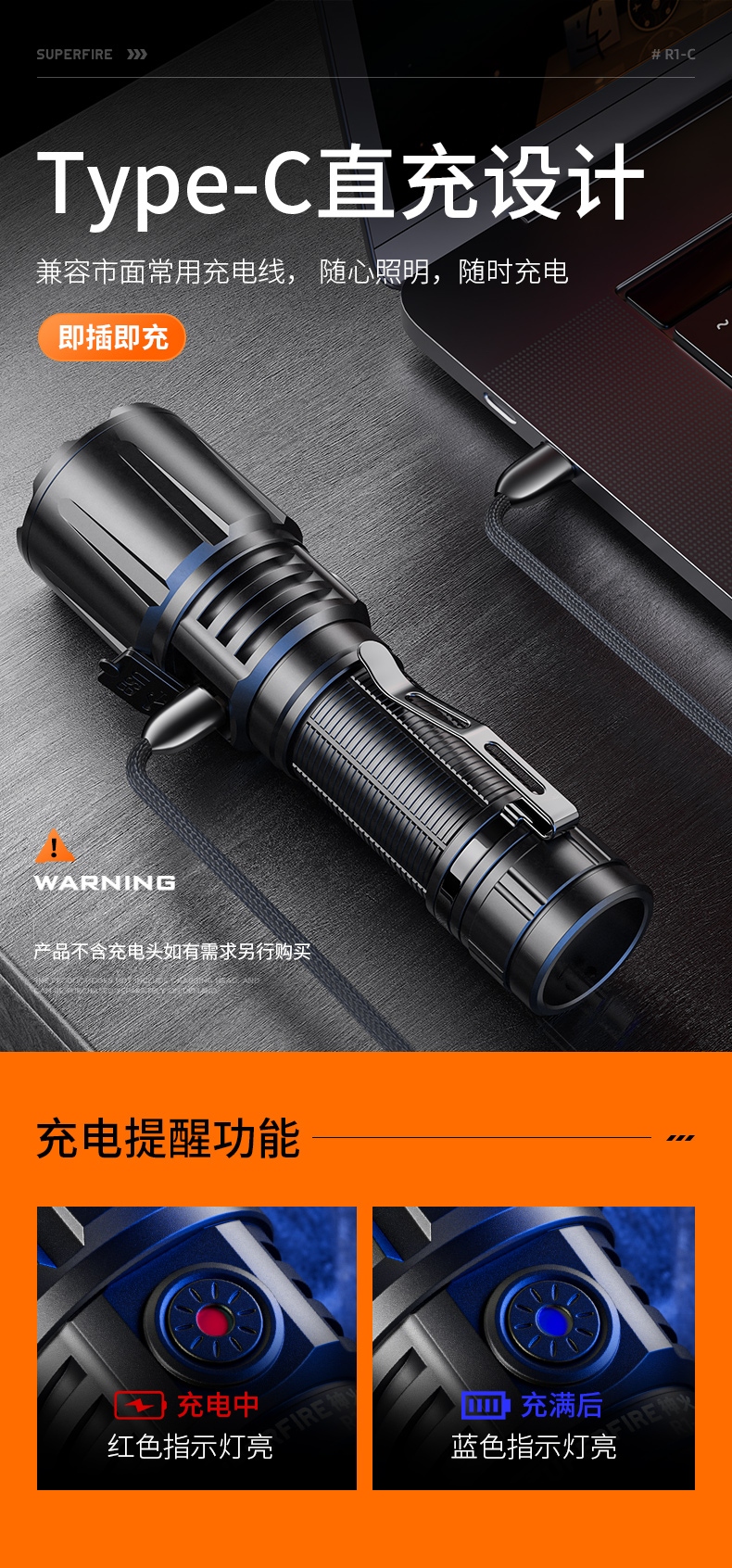 四档调光 Type-C充电 电量显示 铝合金筒身 持久续航 强力防水