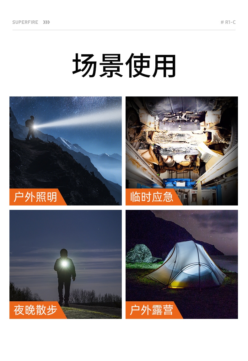 聚光主灯 亮度随心 轻按后端开关按钮,主灯强光点亮,续按依次切换主灯工作光-爆闪光。主灯开启状态下长按5秒,可实现光源色温转换。主灯关闭状态下长按5秒,可开启灯具最亮照明模式。 爆亮强光 亮如白昼 1500LM大功率高亮光源,点亮顷刻如白昼
