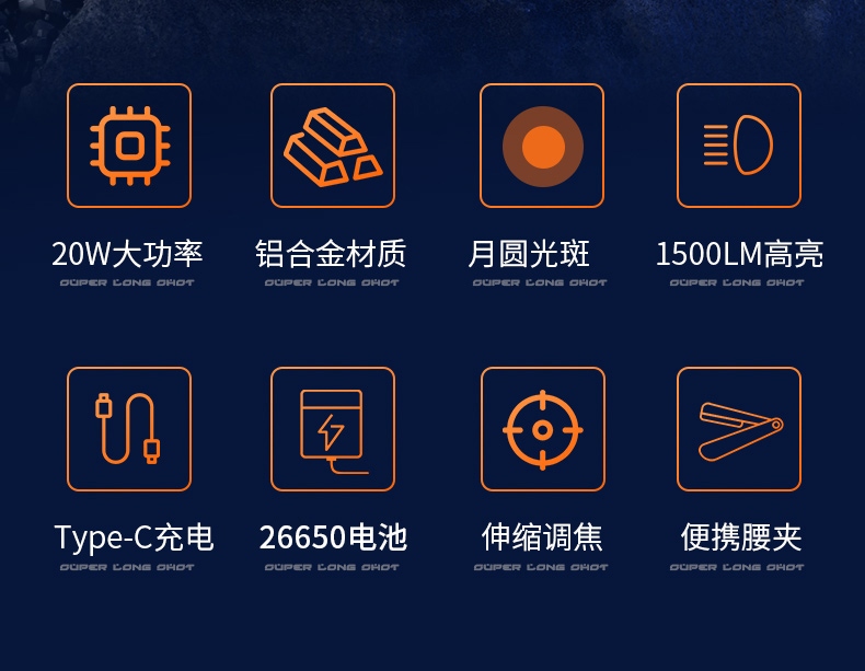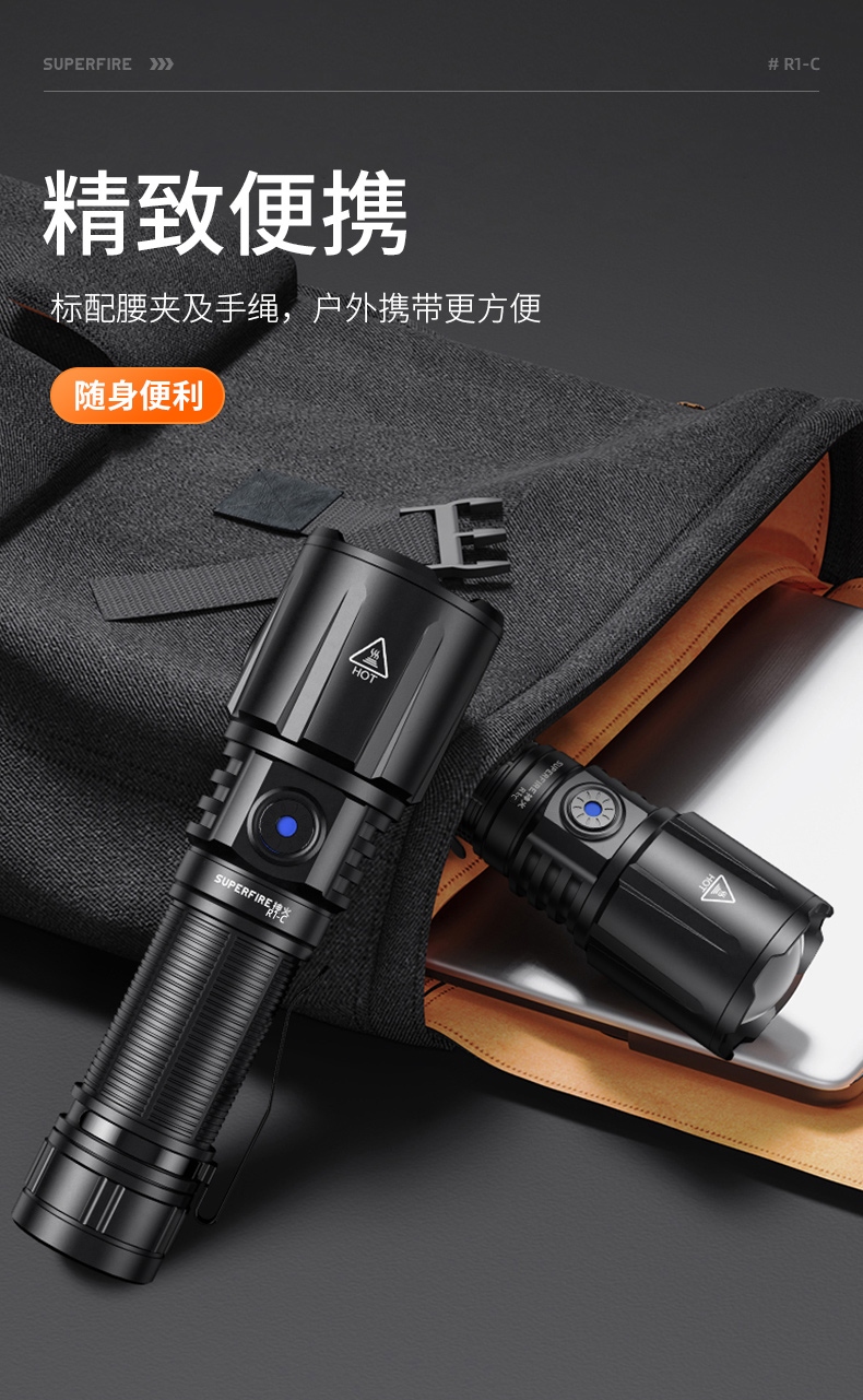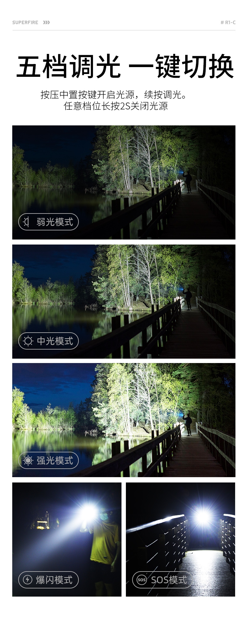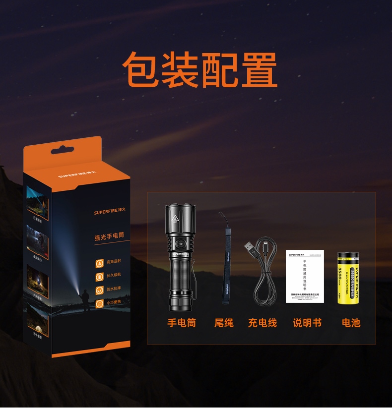 1、推拉灯头可实现伸缩调焦。 2、含腰夹及手绳,多种携带方式,携带更方便。 3、圆形光斑,聚光时,光斑圆润,照明效果好。