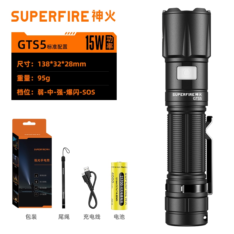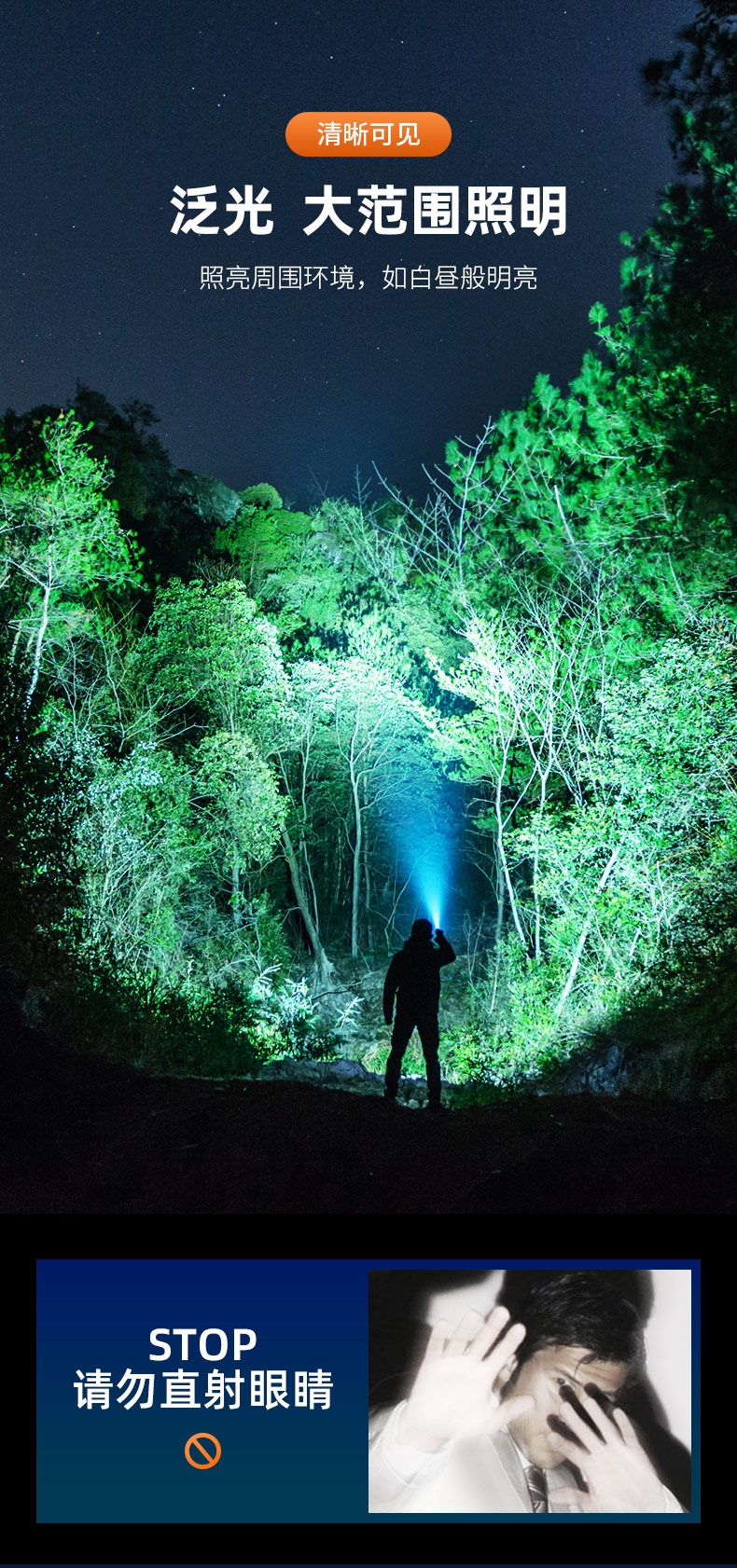 1、千米远射,射程更远,光斑更聚焦。 2、进口灯珠,亮度高,照明效果更好。 3、前后双按键,光源一键点亮,高亮瞬间开启。