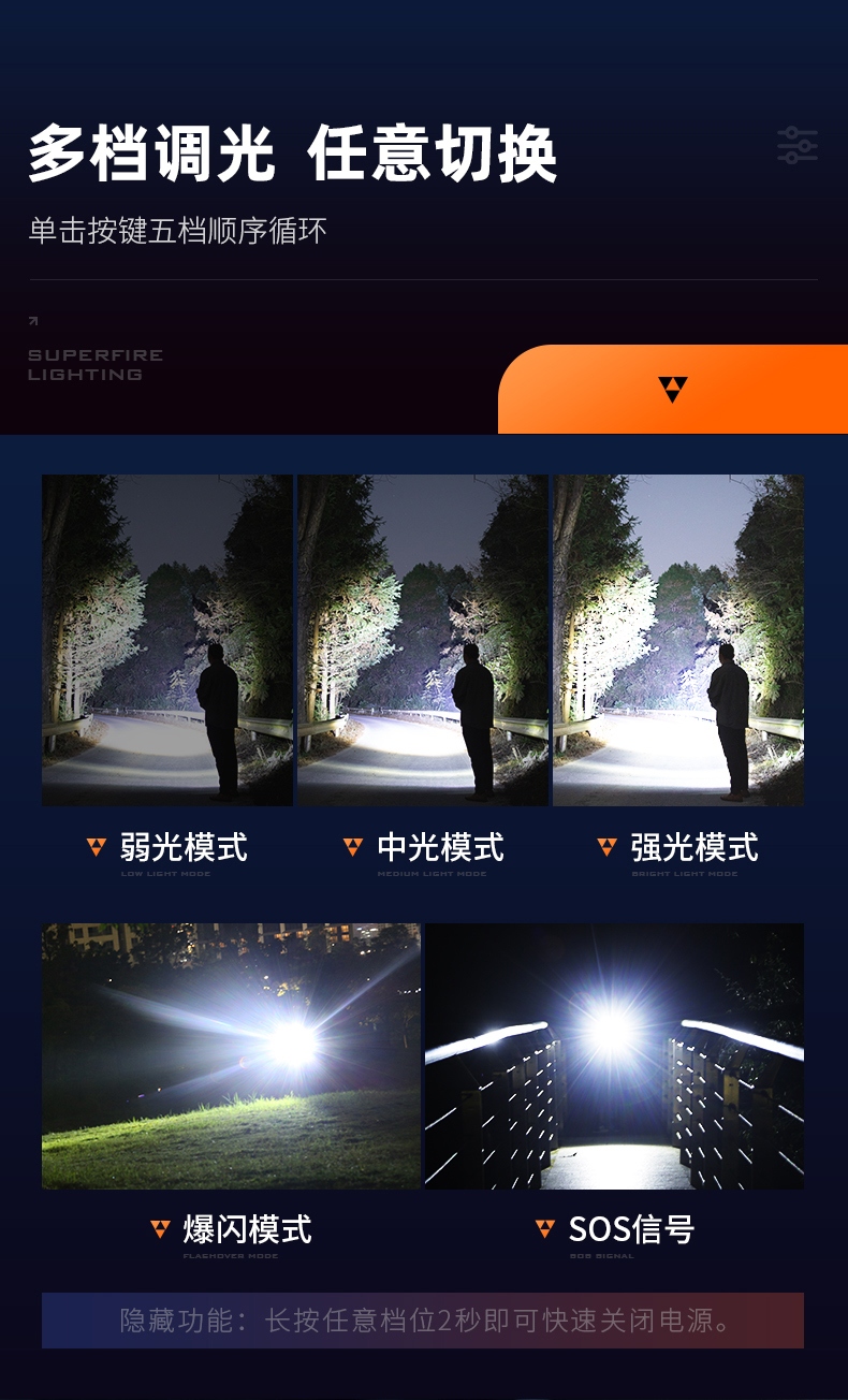 1、六档调光,可满足不同使用场景下的照明需求。 2、进口高亮朗明纳斯灯珠,照明效果更好。 3、含档位记忆,任意档位快捷关机 ,开机恢复关机前档位。