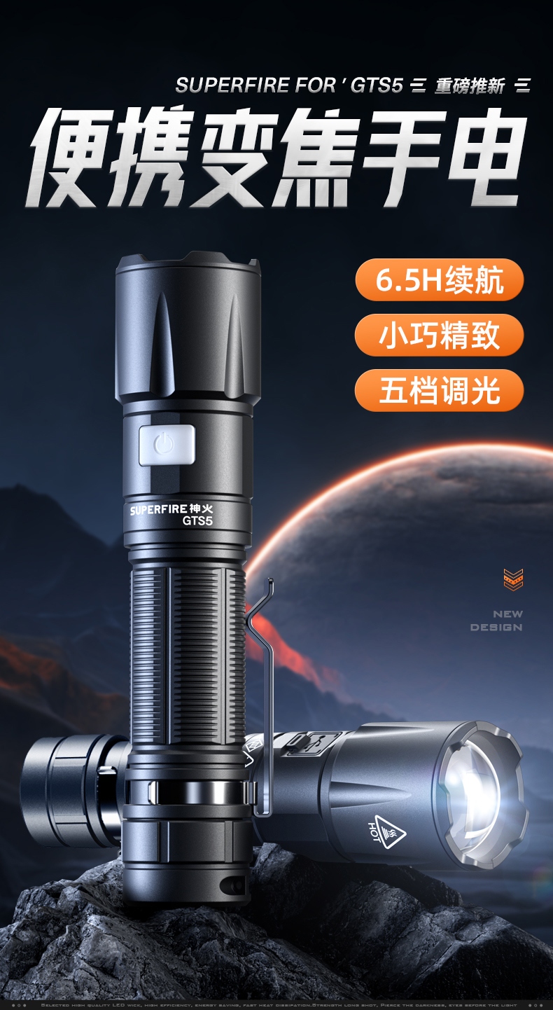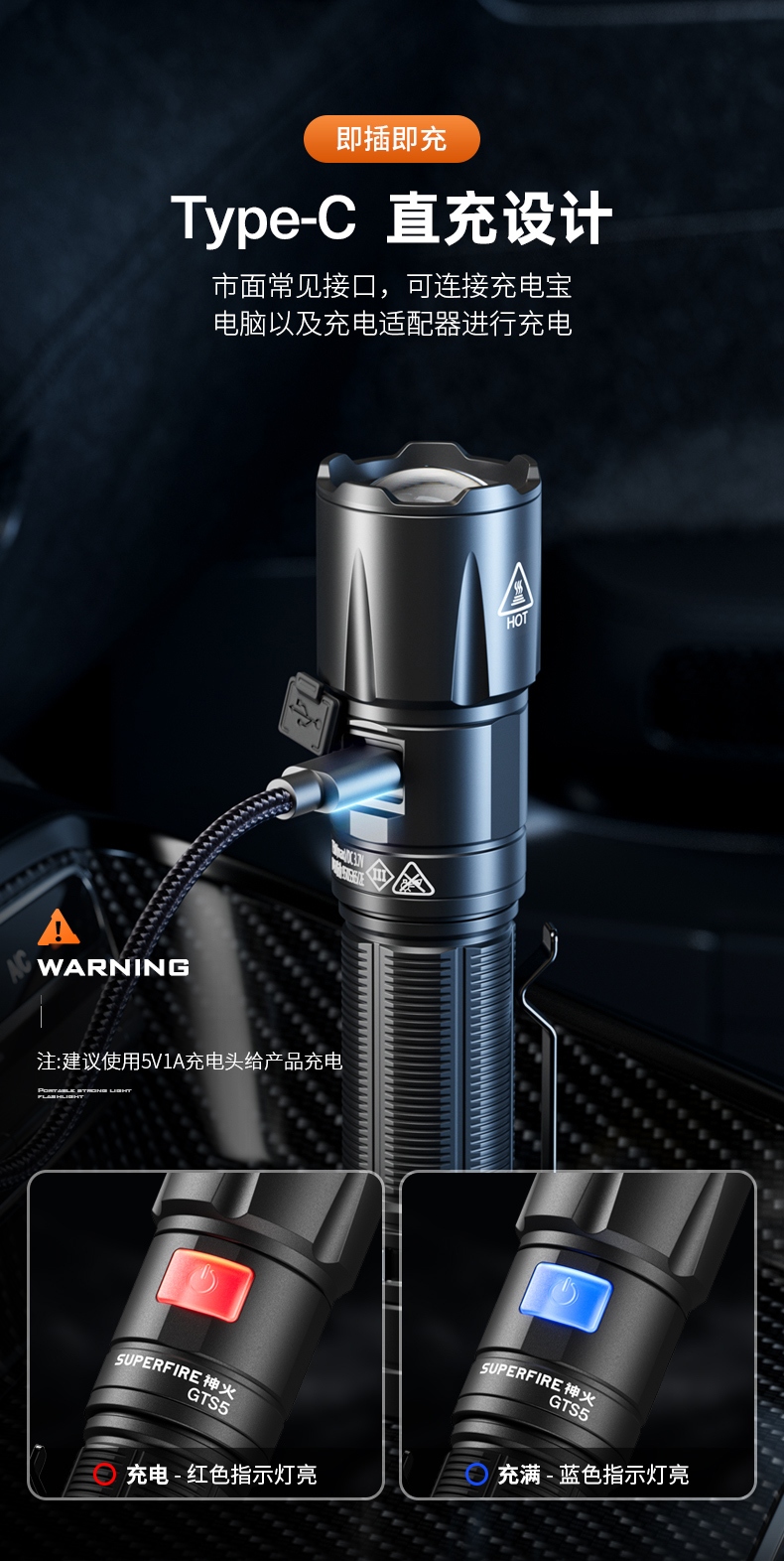 1、推拉灯头可实现伸缩调焦 2、聚光时圆形光斑,光斑圆润,照明效果更好 3、铝合金外壳,防水耐摔 4、多重安全程序,有效延长手电使用寿命 5、外观时尚,引领潮流 6、多种电池兼容,满足不同客户需求 7、Type-c充电,正反盲插。 8、含腰夹及手绳孔设计,