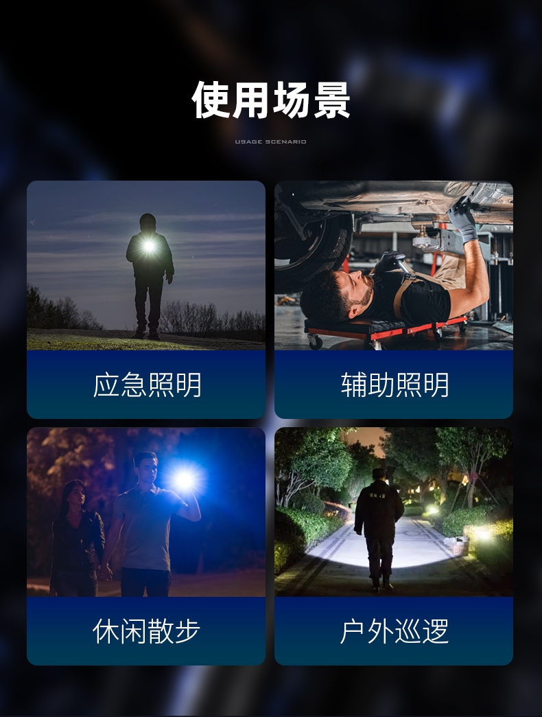 聚光主灯 亮度随心 轻按后端开关按钮,主灯强光点亮,续按依次切换主灯工作光-爆闪光。主灯开启状态下长按5秒,可实现光源色温转换。主灯关闭状态下长按5秒,可开启灯具最亮照明模式。 爆亮强光 亮如白昼 1500LM大功率高亮光源,点亮顷刻如白昼