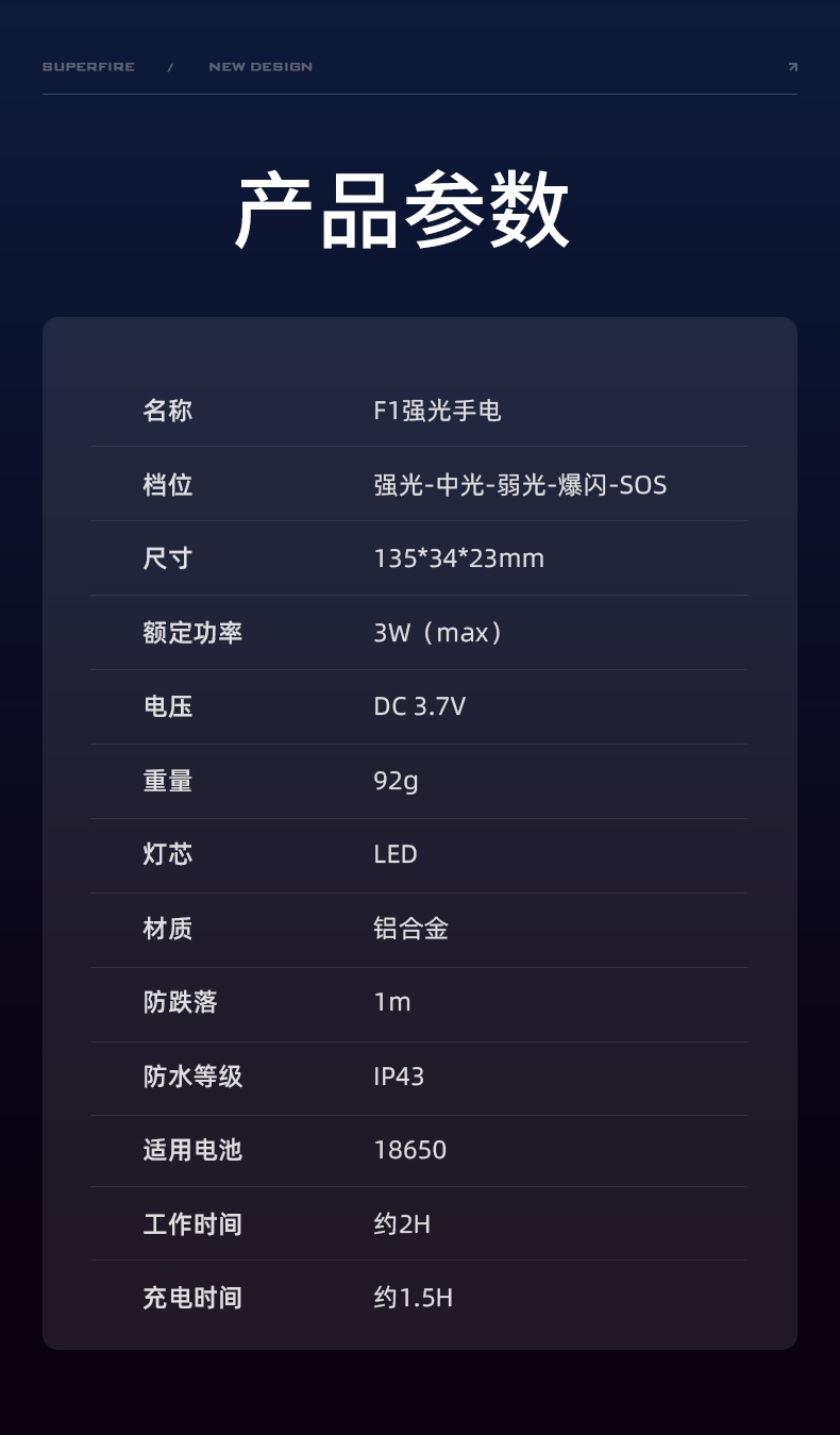 聚光主灯 亮度随心 轻按后端开关按钮,主灯强光点亮,续按依次切换主灯工作光-爆闪光。主灯开启状态下长按5秒,可实现光源色温转换。主灯关闭状态下长按5秒,可开启灯具最亮照明模式。 爆亮强光 亮如白昼 1500LM大功率高亮光源,点亮顷刻如白昼