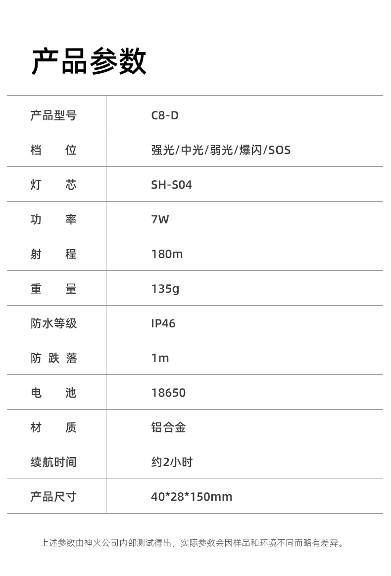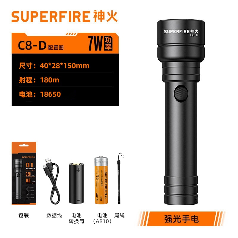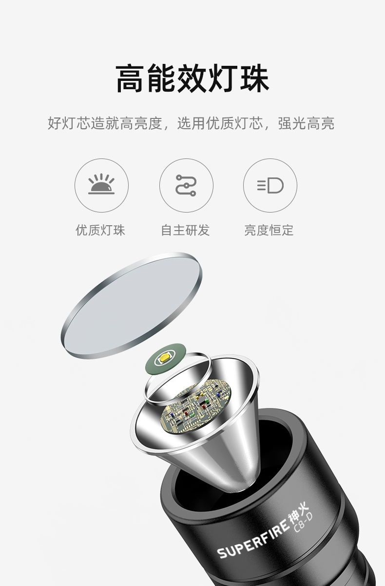 1、千米远射,射程更远,光斑更聚焦。 2、进口灯珠,亮度高,照明效果更好。 3、前后双按键,光源一键点亮,高亮瞬间开启。