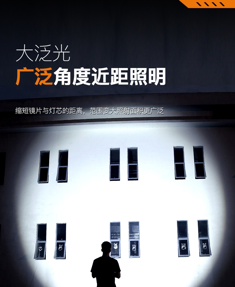 聚光主灯 亮度随心 轻按后端开关按钮,主灯强光点亮,续按依次切换主灯工作光-爆闪光。主灯开启状态下长按5秒,可实现光源色温转换。主灯关闭状态下长按5秒,可开启灯具最亮照明模式。 爆亮强光 亮如白昼 1500LM大功率高亮光源,点亮顷刻如白昼