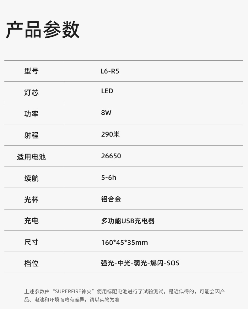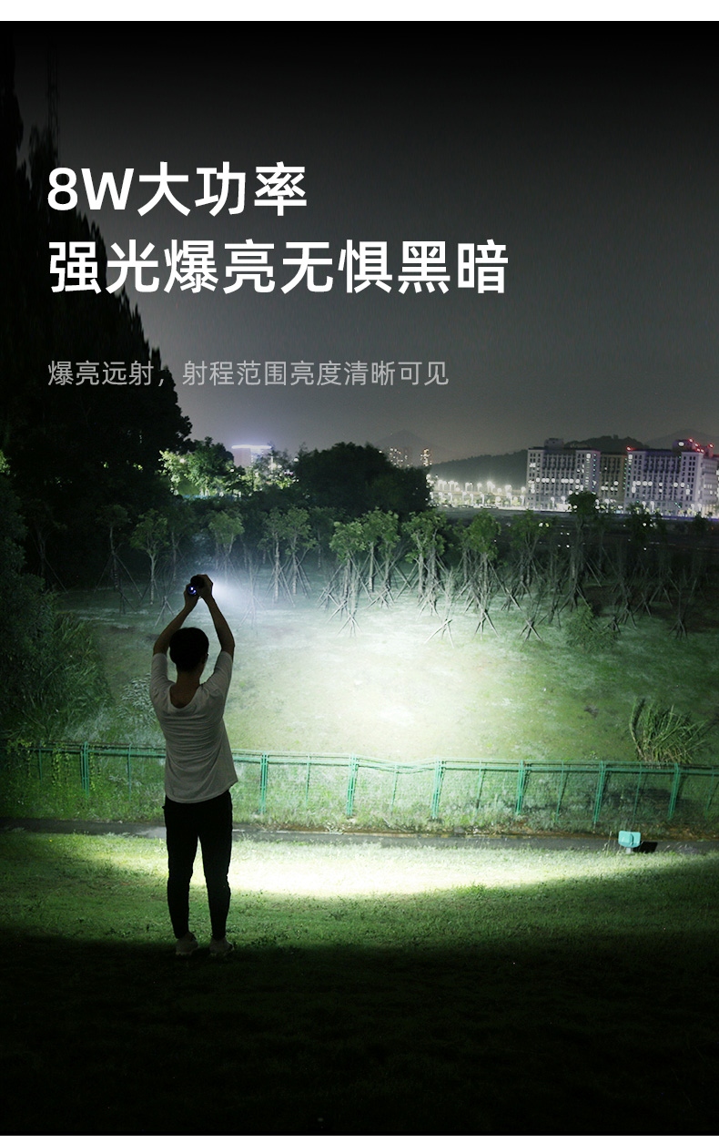 1、千米远射,射程更远,光斑更聚焦。 2、进口灯珠,亮度高,照明效果更好。 3、前后双按键,光源一键点亮,高亮瞬间开启。