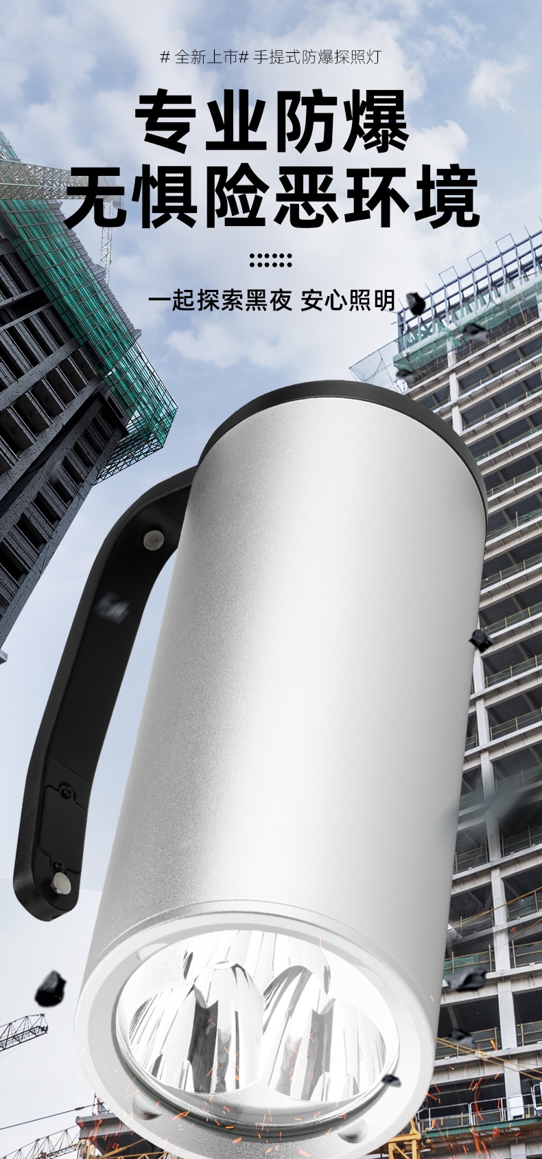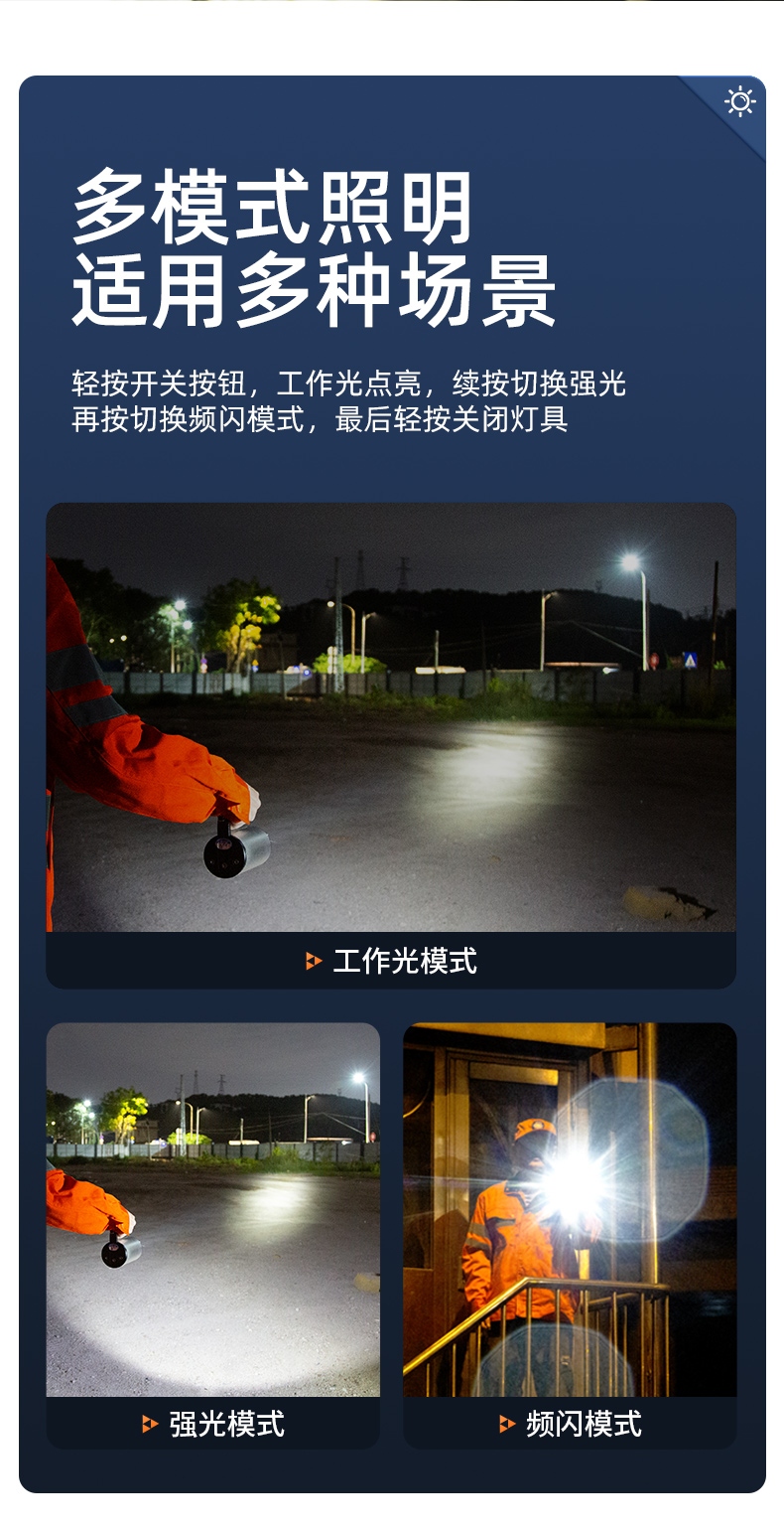 1、多档调光,可满足不同使用场景下的照明需求; 2、含提手,握感更舒适。携带更简单; 3、新型高亮远射灯珠,60W大功率,亮度高,照明效果好。