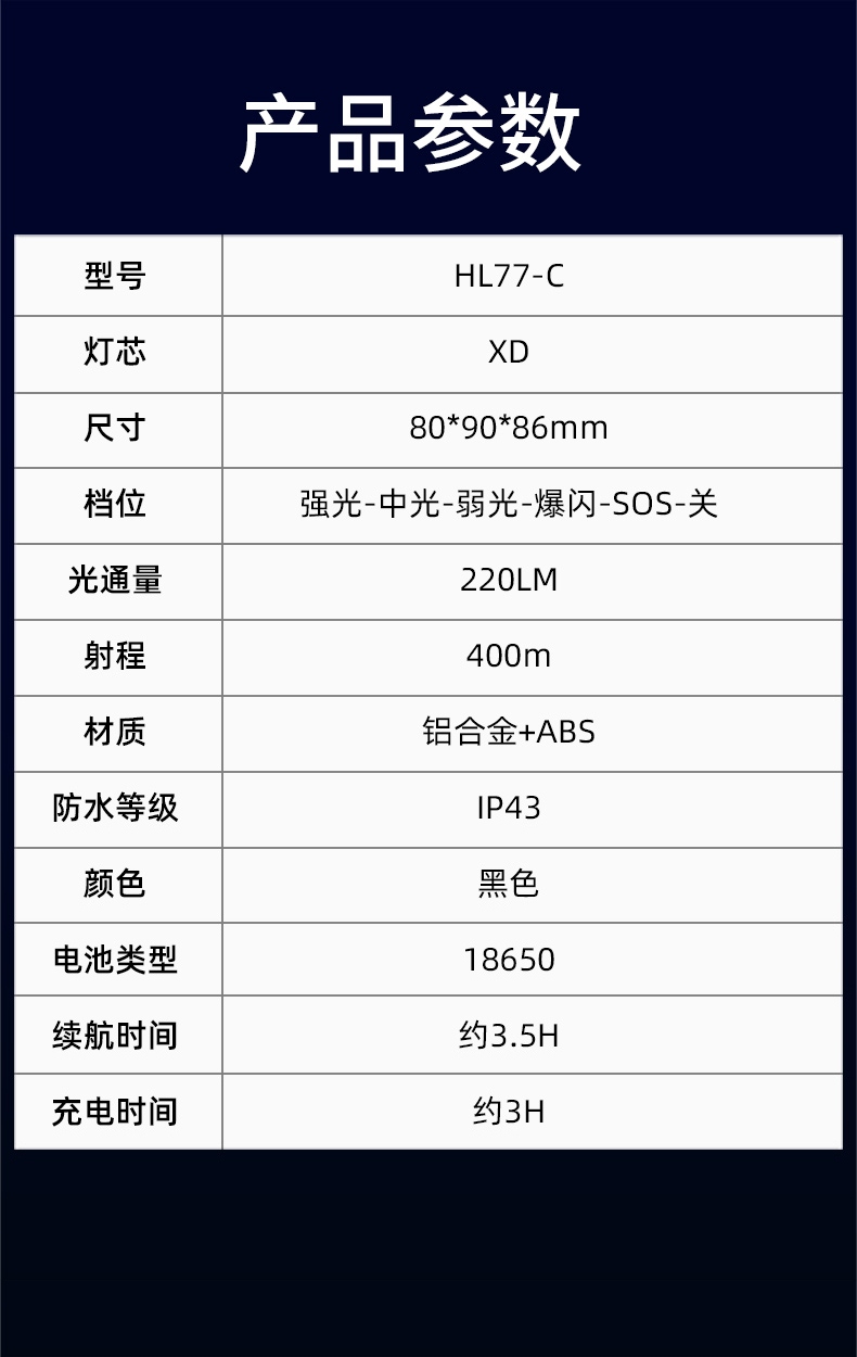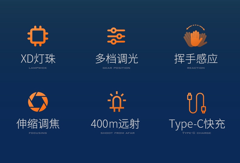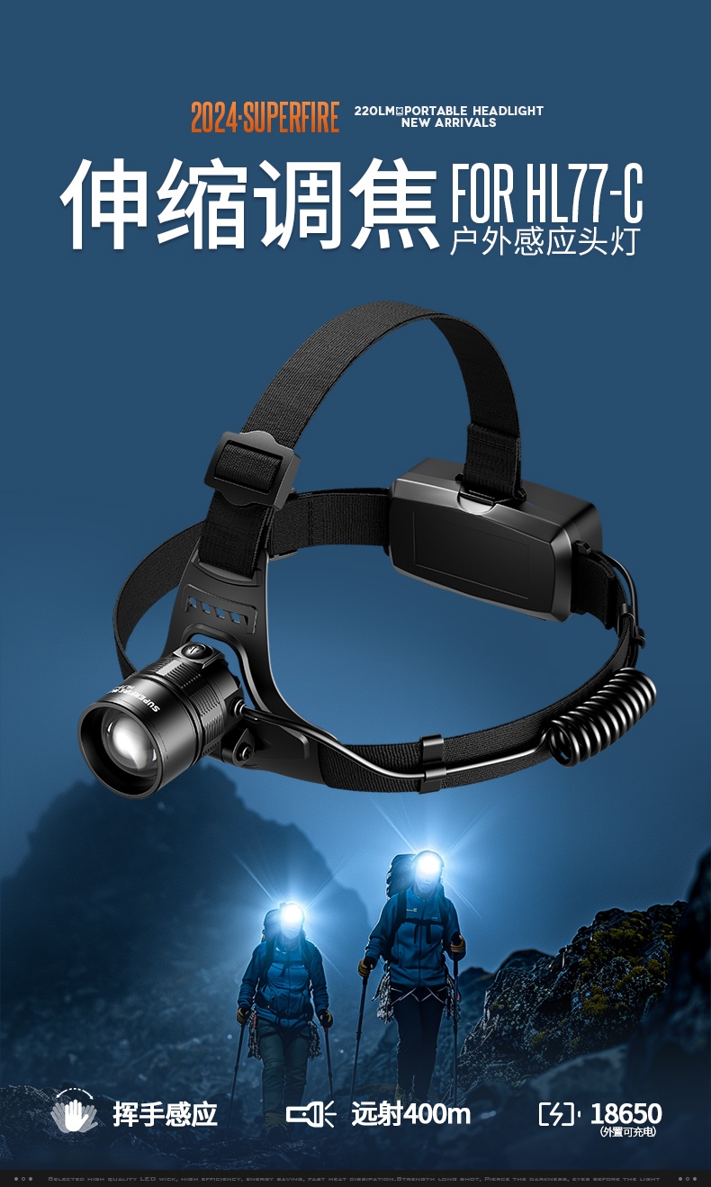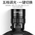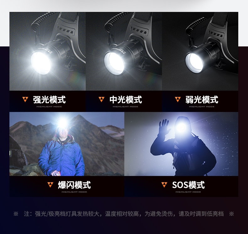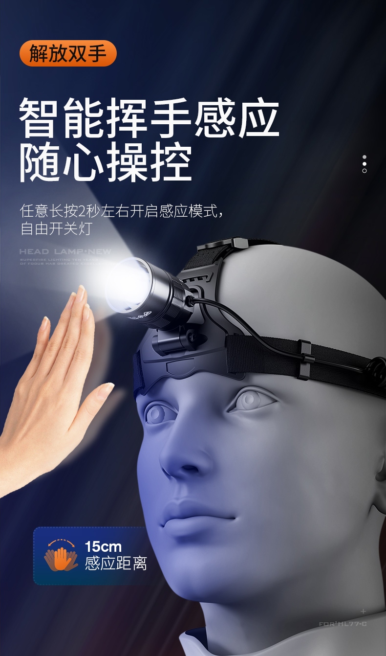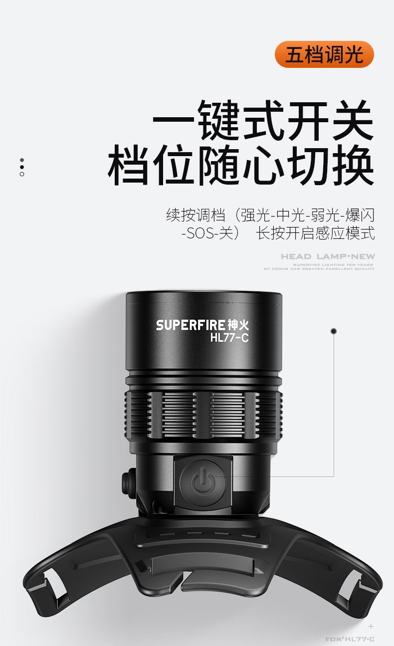 2.开启光源:按压灯头开关按键开启即强光档 ,续按调档(强光-中光-弱光-爆闪-SOS-关)可顺序调档;任意长按2秒左右开启感应模式(手扫可开关光源)同时感应指示灯亮。