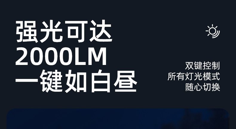 聚光主灯 亮度随心 轻按后端开关按钮,主灯强光点亮,续按依次切换主灯工作光-爆闪光。主灯开启状态下长按5秒,可实现光源色温转换。主灯关闭状态下长按5秒,可开启灯具最亮照明模式。 爆亮强光 亮如白昼 1500LM大功率高亮光源,点亮顷刻如白昼