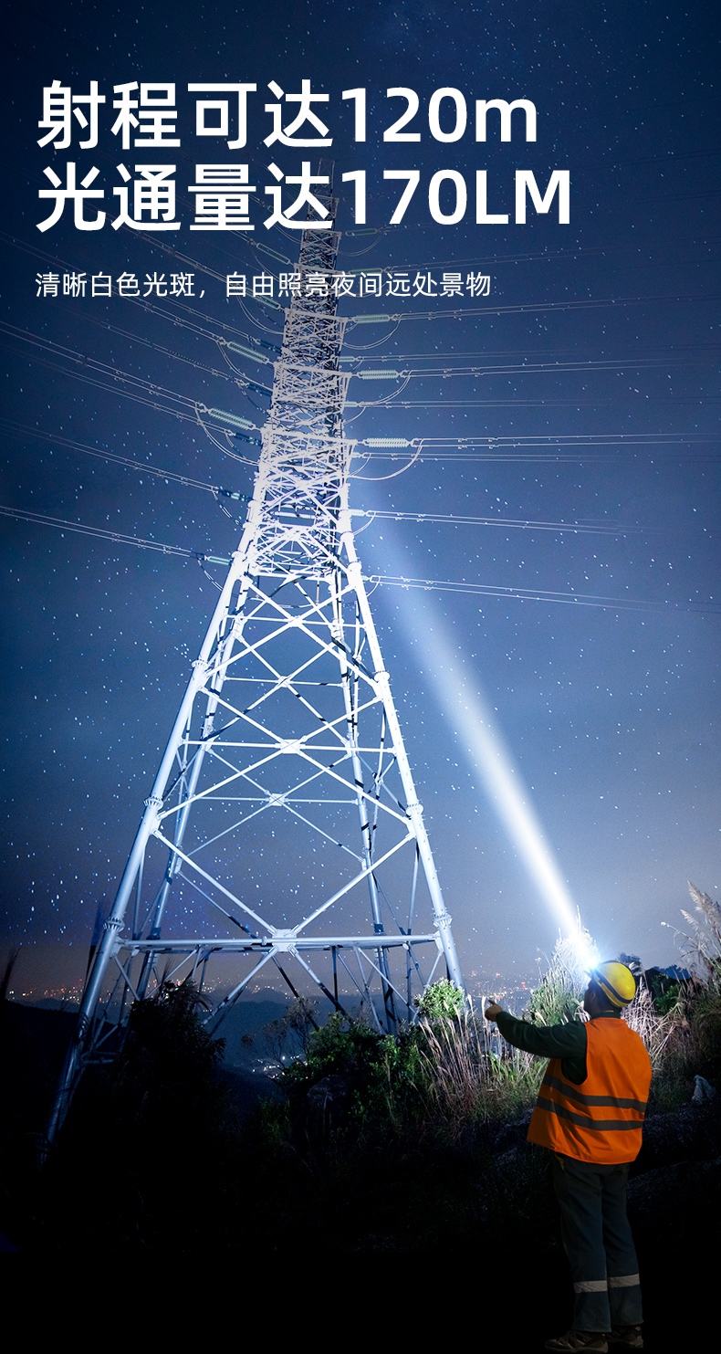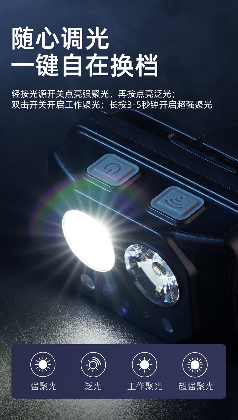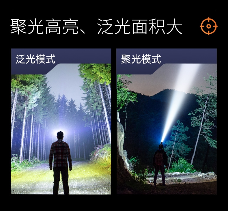 轻按光源开关点亮强聚光,再按点亮泛光;双击开关开启工作聚光;长按3-5秒钟开启超强聚光