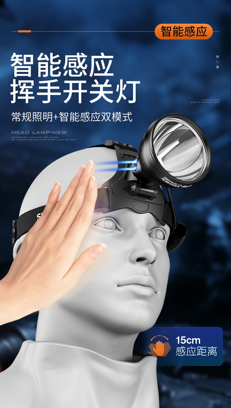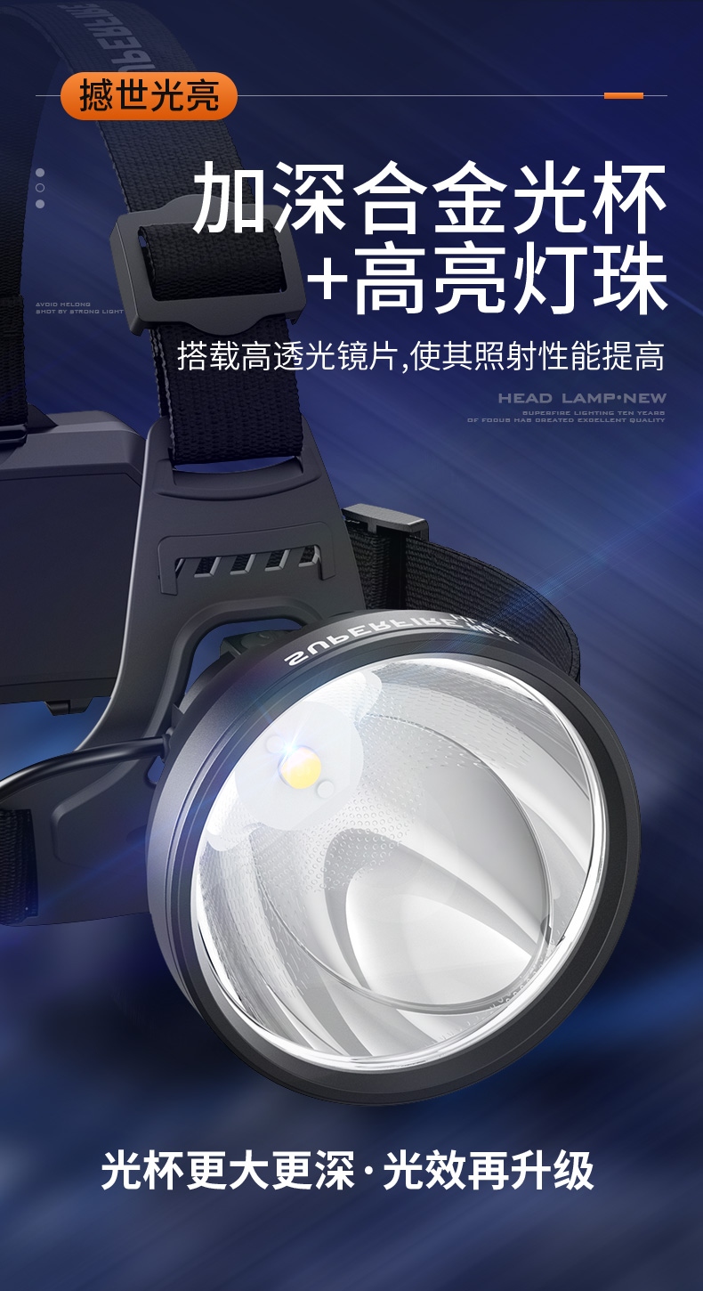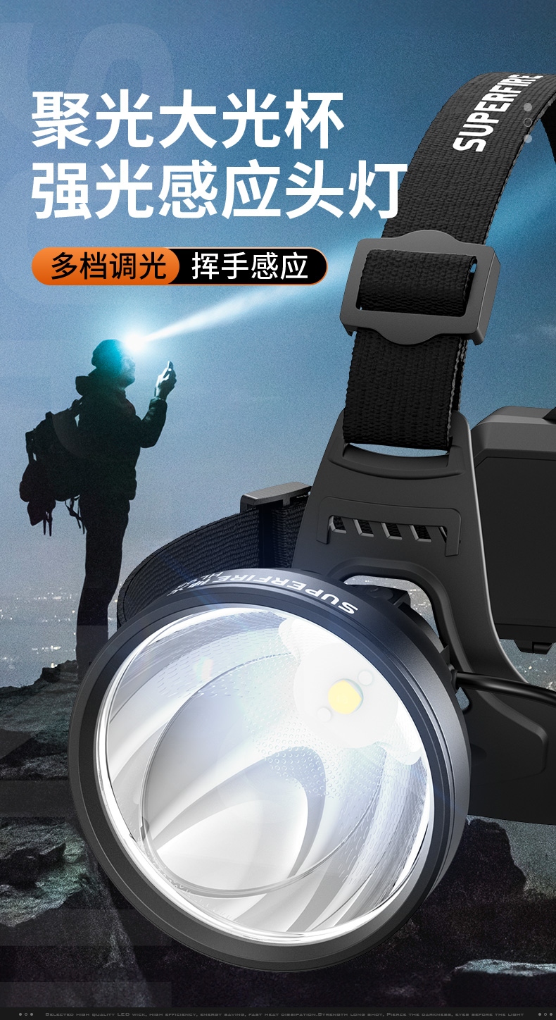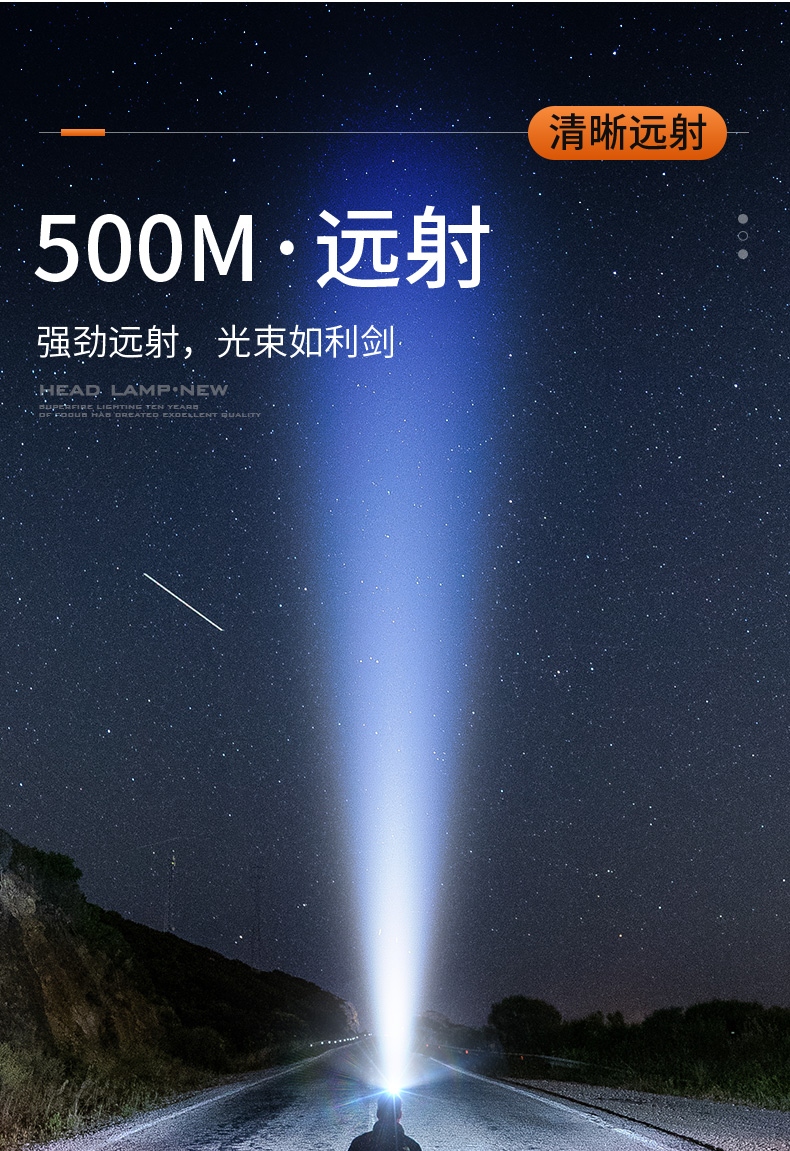 强光亮度,运动头灯,前后均衡设计,轻便不压头,可调节式头灯带,佩戴方便舒适,伸缩调焦,光照范围大,照射距离远,头灯角度调节,超90度角度随意调节,适宜各种环境使用