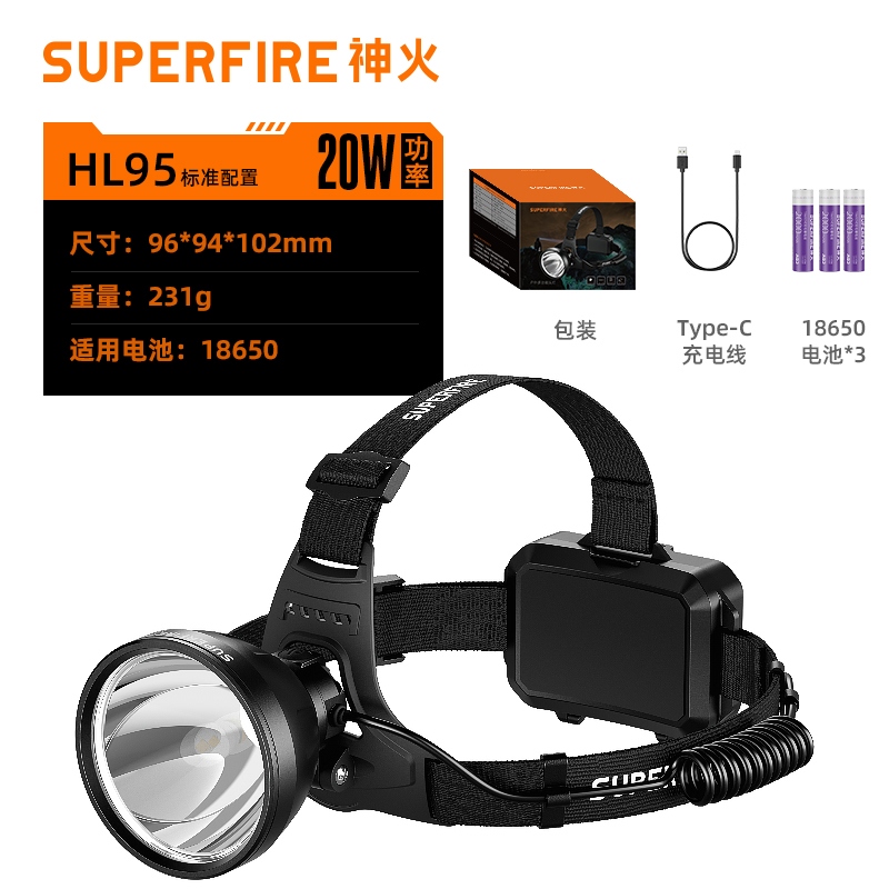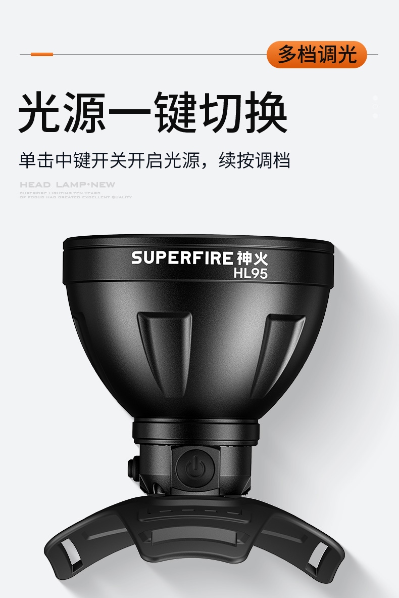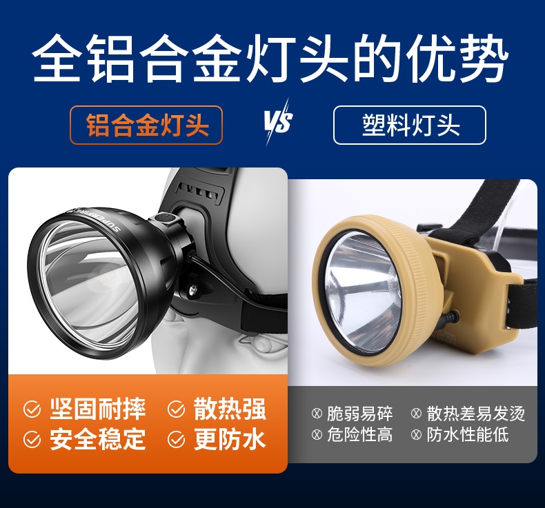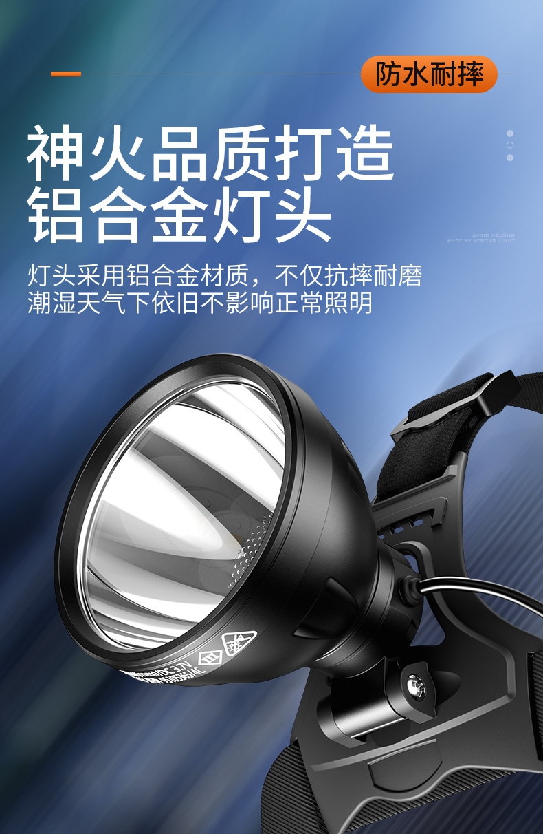 1、20W大功率,亮度高,照面效果好。 2、铝合金头部,防水耐摔。 3、头灯角度调节:超90°角度随意调节,适宜各环境使用。