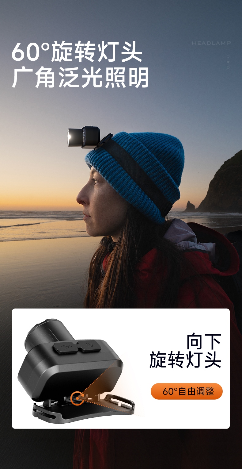 4.头灯角度调节:超60°角度随意调节,适宜各环境使用。