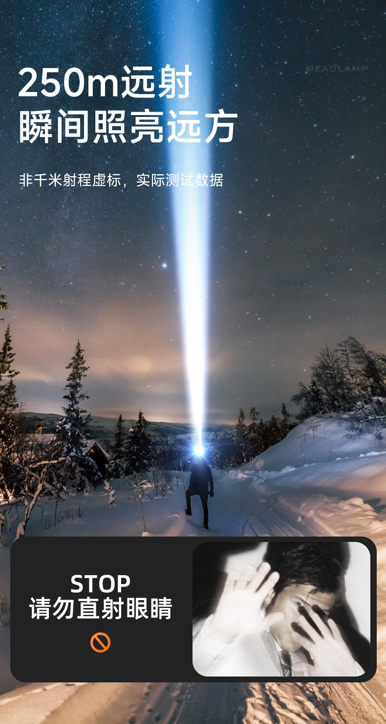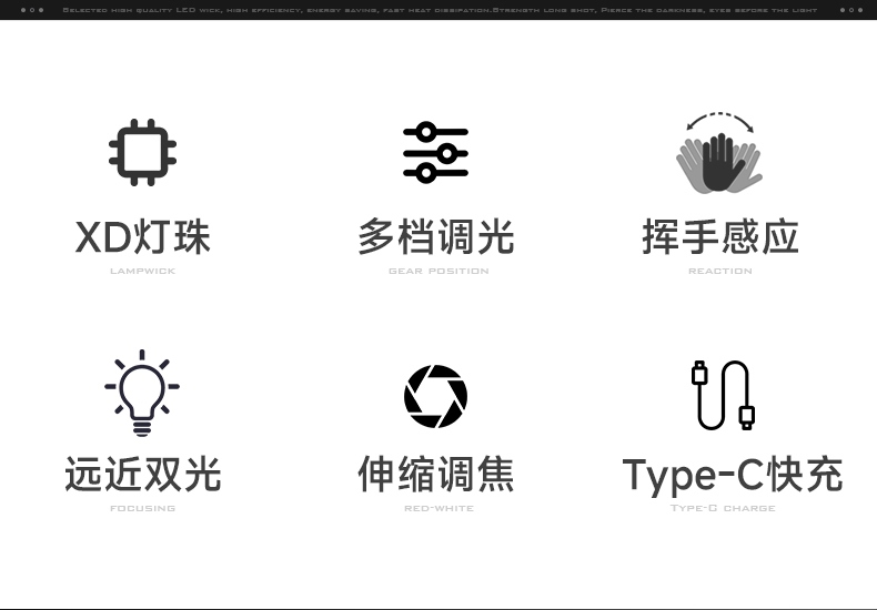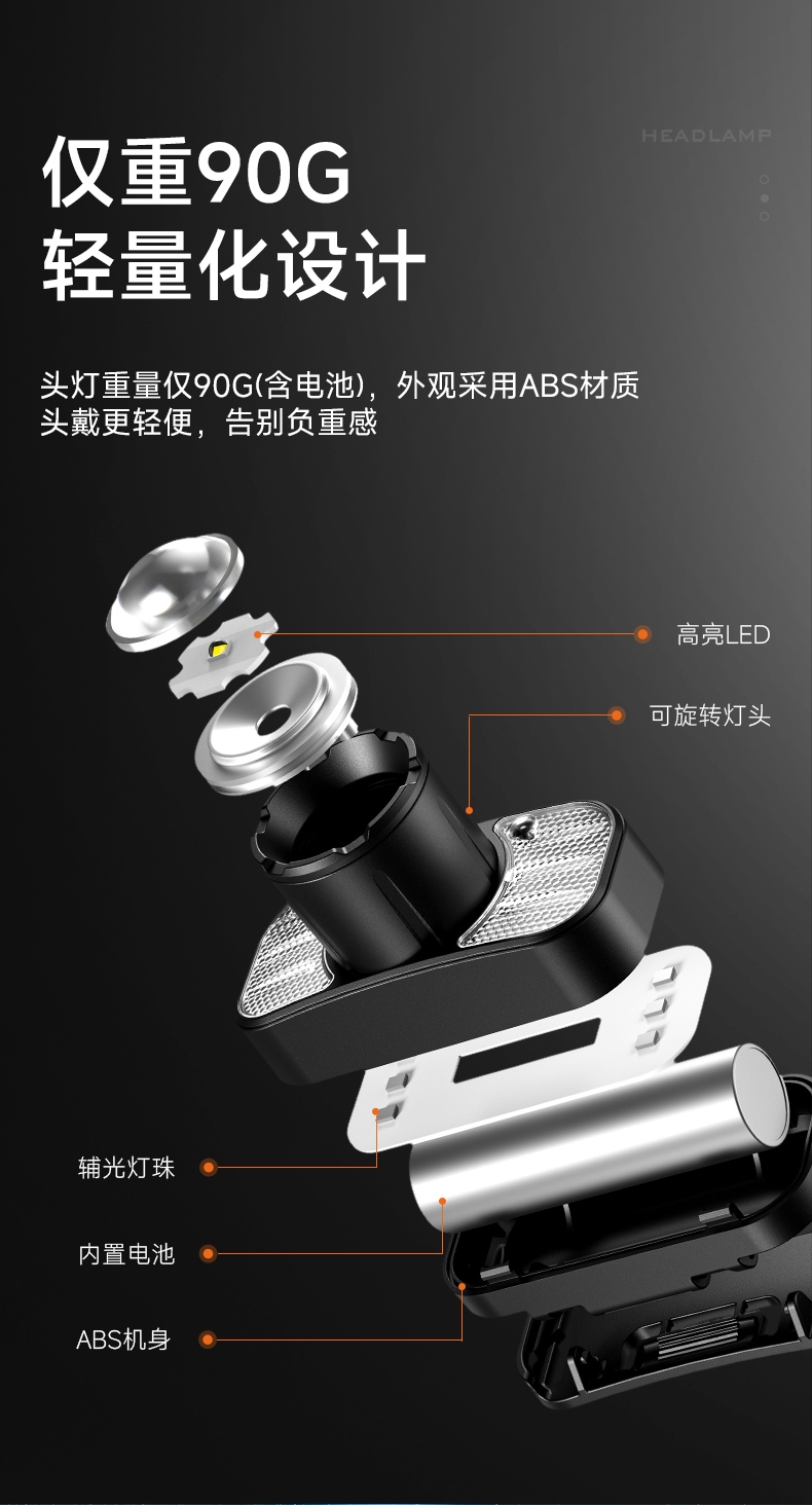 强光亮度,运动头灯,前后均衡设计,轻便不压头,可调节式头灯带,佩戴方便舒适,伸缩调焦,光照范围大,照射距离远,头灯角度调节,超90度角度随意调节,适宜各种环境使用