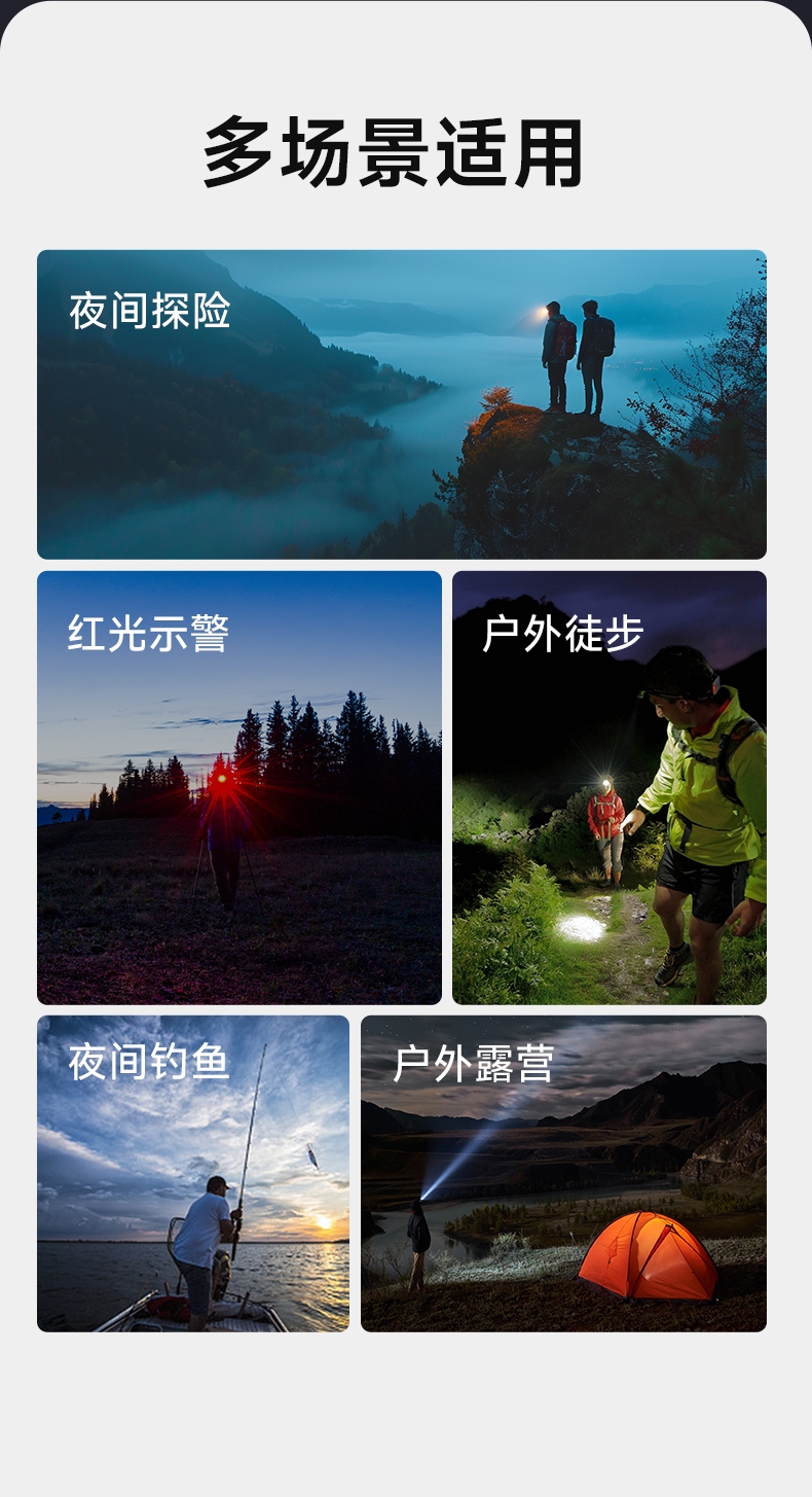 1.五档一体:强中弱、爆闪、SOS自由切换,可满足不同场景下的使用需求 。