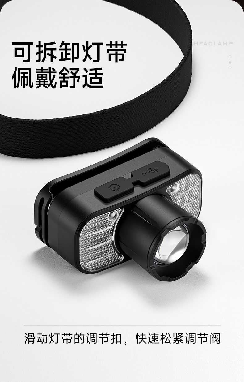6.此款头灯款式潮流、设计小巧、携带方便、头带材质柔软、可自由拆卸、便于清洗。