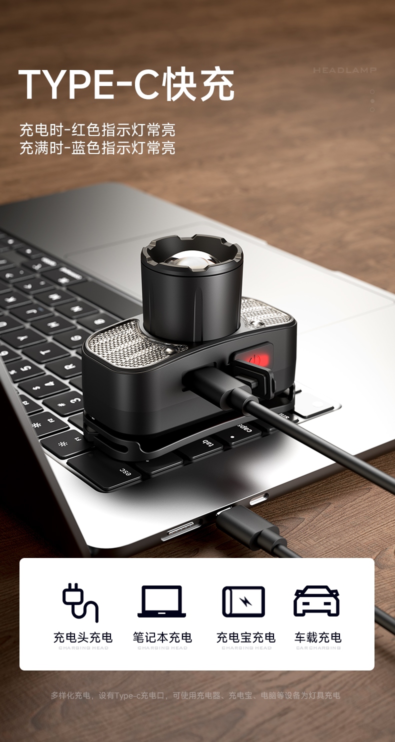 5.多样化充电,使用方便:设有Type-c充电口,可使用充电器、充电宝、电脑等设备为灯具充电。