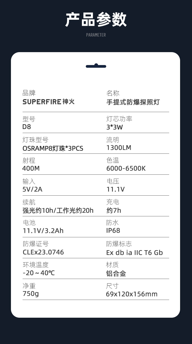 产品中心 > 工业照明 > 防爆产品 > 防爆手电 > Superfire神火防爆手提探照灯D8