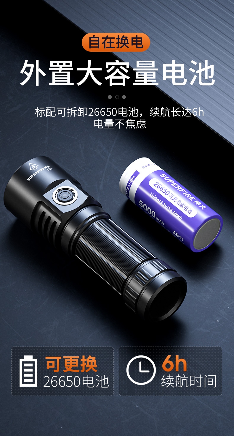 9、外置26650,可随时换电池使用。