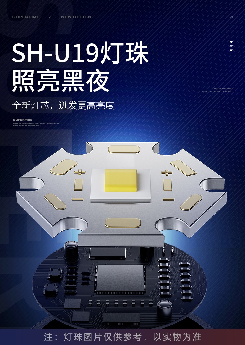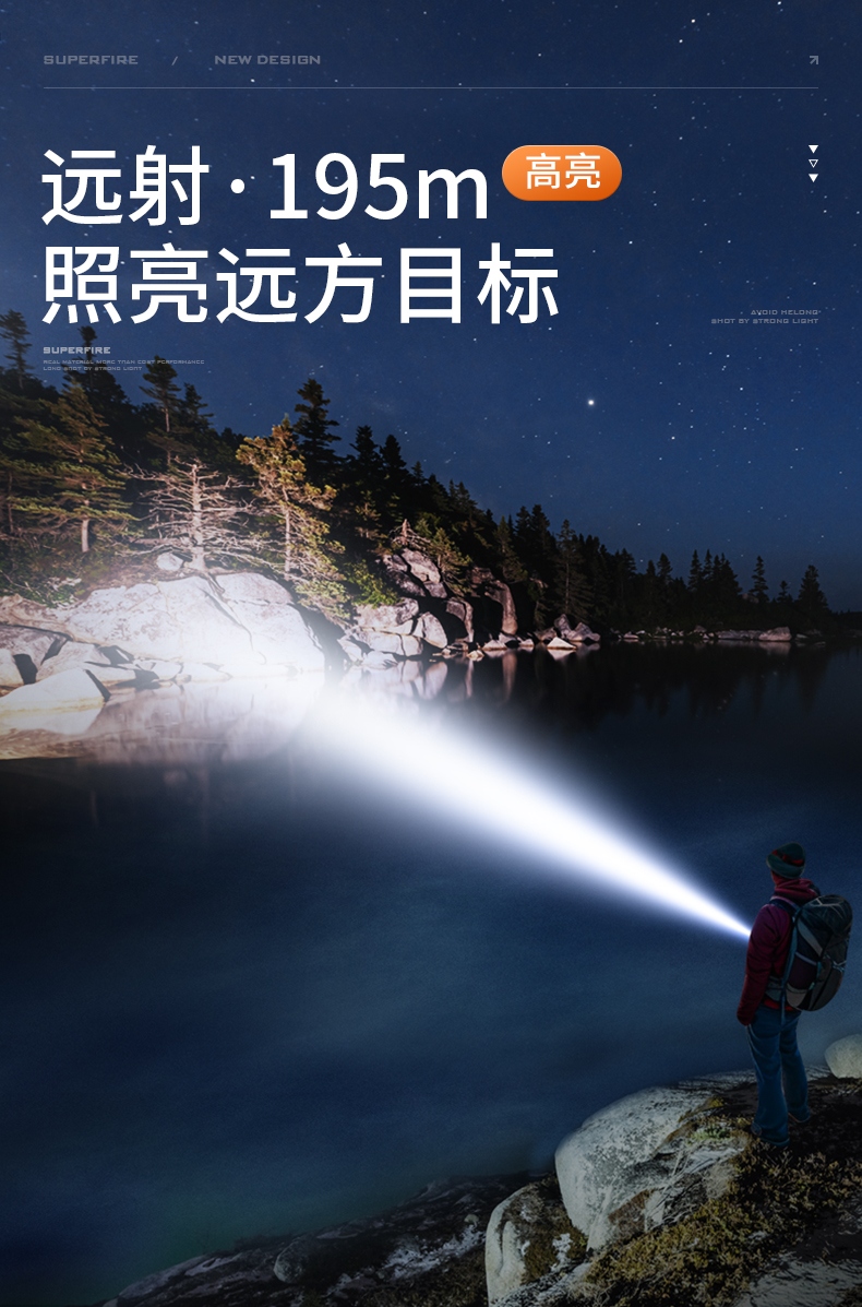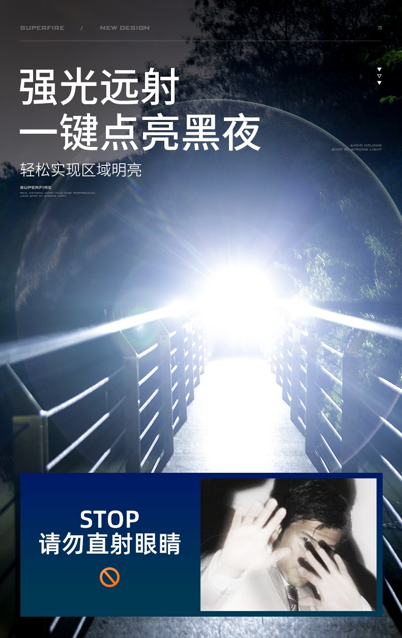 1、千米远射,射程更远,光斑更聚焦。 2、进口灯珠,亮度高,照明效果更好。 3、前后双按键,光源一键点亮,高亮瞬间开启。