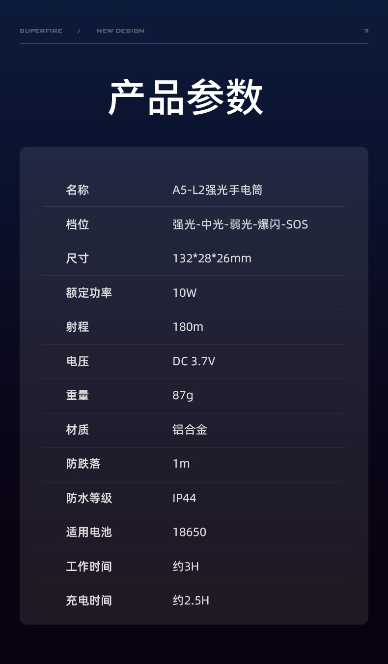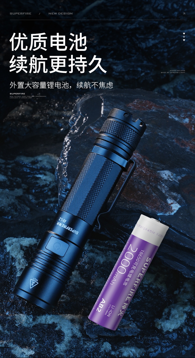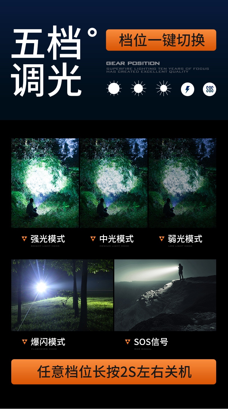 1、多档调光,可满足不同使用场景下的照明需求。 2、多种安全程序,可有效保护手电使用安全,延长手电使用寿命。 3、非精致外观,时尚小巧。