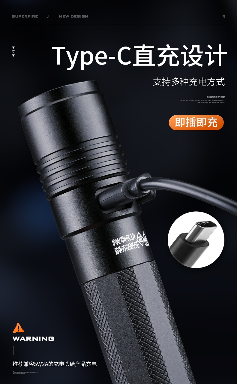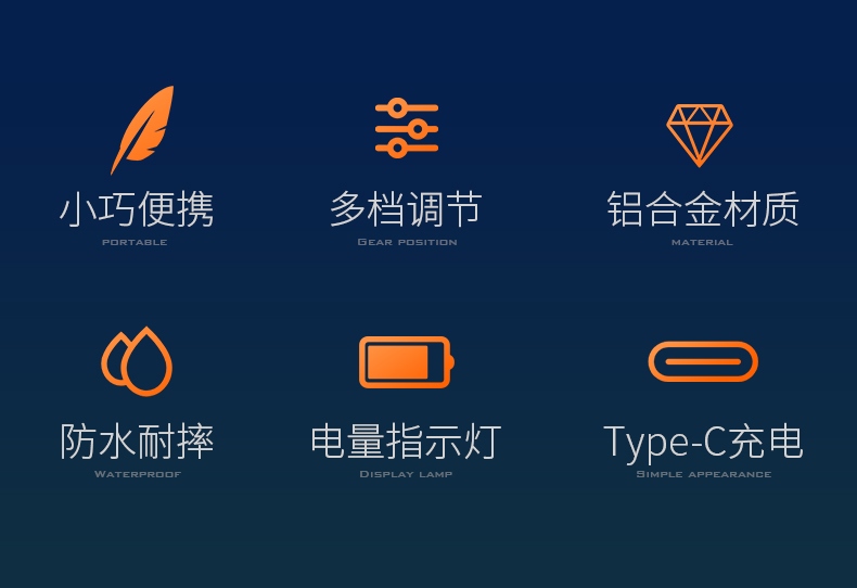 四档调光 Type-C充电 电量显示 铝合金筒身 持久续航 强力防水