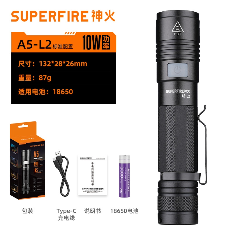 1、千米远射,射程更远,光斑更聚焦。 2、进口灯珠,亮度高,照明效果更好。 3、前后双按键,光源一键点亮,高亮瞬间开启。