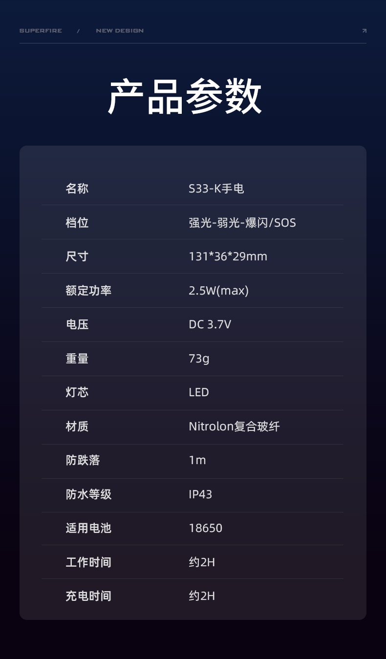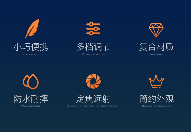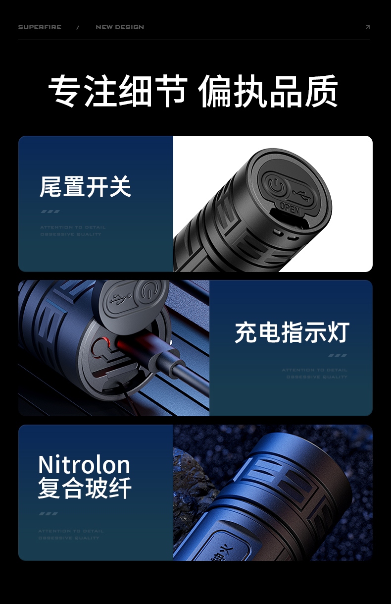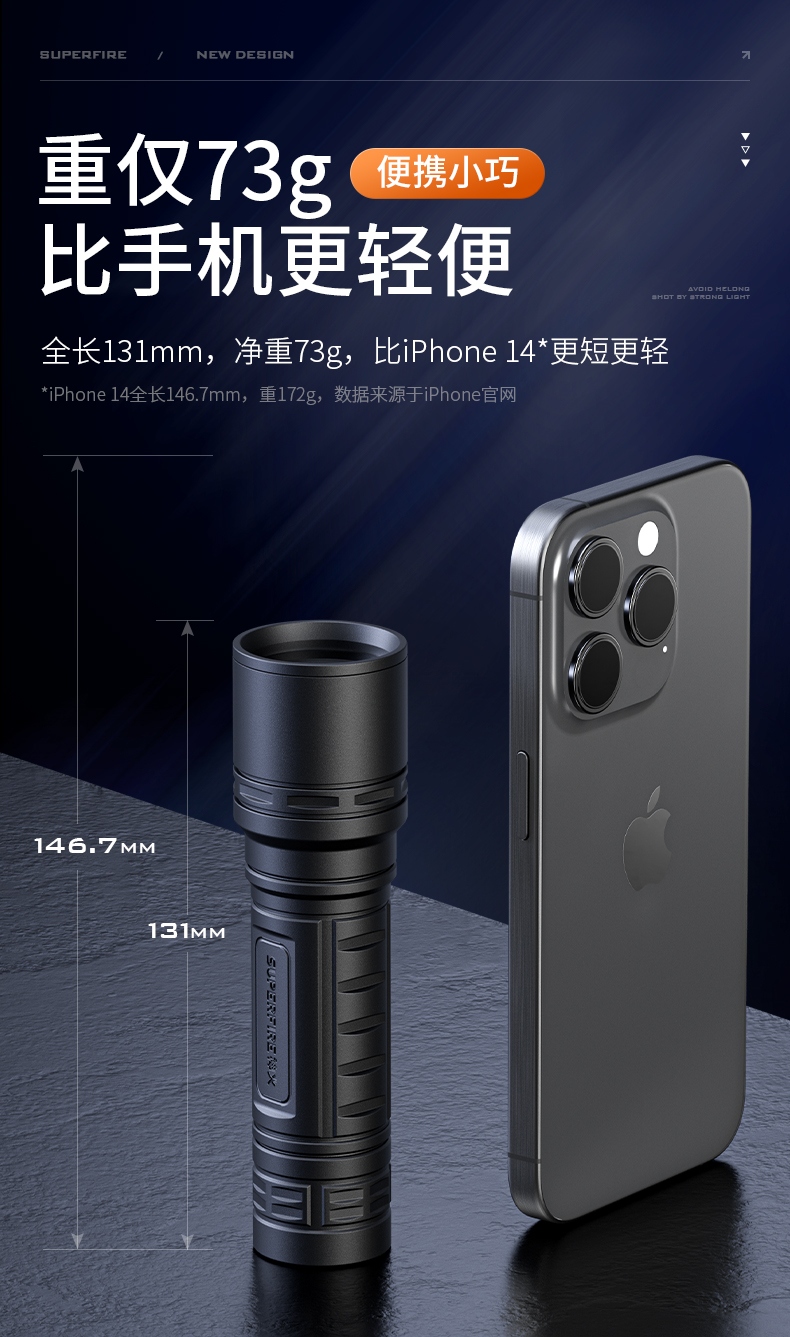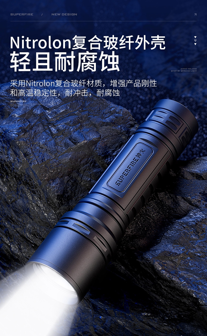 1、四档调光,满足不同场景下的使用需求 。 2、小巧便携,重量轻,携带更方便。 3、采用Nitrolon玻纤复合材质,增强产品刚性和高温稳定性 ,耐冲击,耐腐蚀。