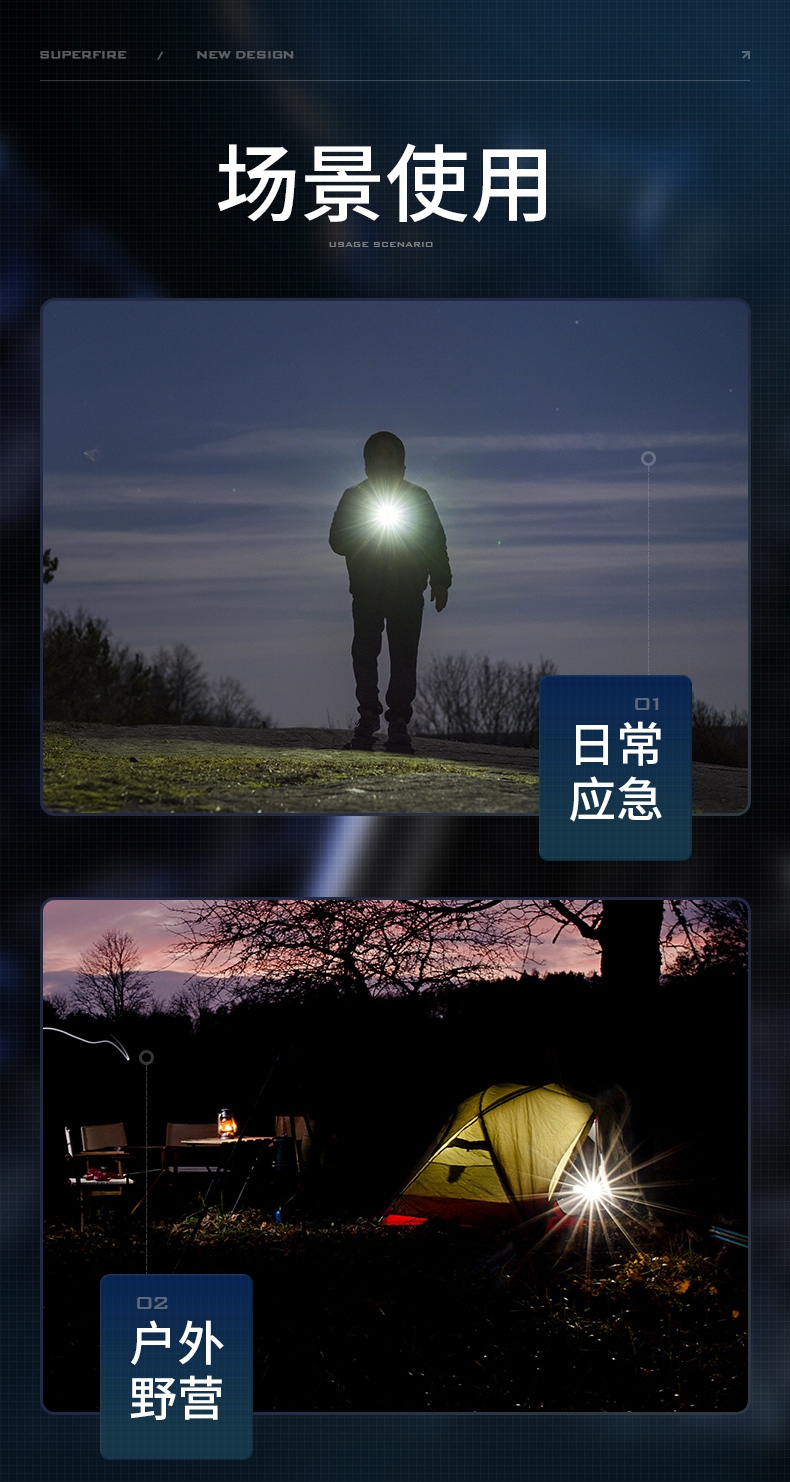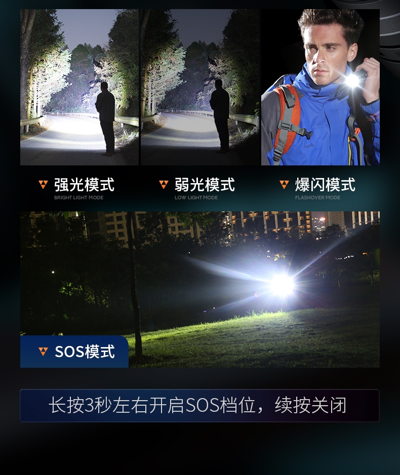 聚光主灯 亮度随心 轻按后端开关按钮,主灯强光点亮,续按依次切换主灯工作光-爆闪光。主灯开启状态下长按5秒,可实现光源色温转换。主灯关闭状态下长按5秒,可开启灯具最亮照明模式。 爆亮强光 亮如白昼 1500LM大功率高亮光源,点亮顷刻如白昼