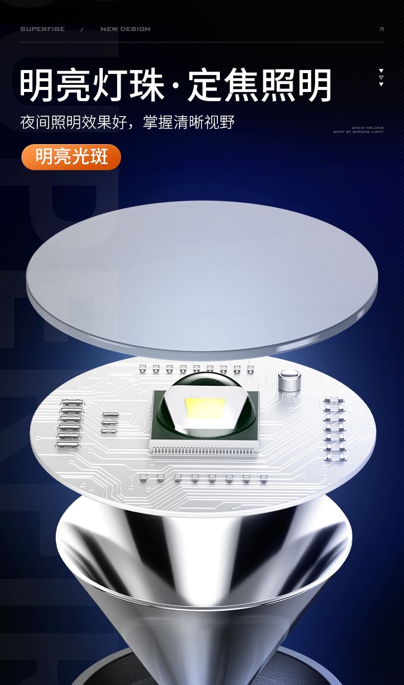 1、千米远射,射程更远,光斑更聚焦。 2、进口灯珠,亮度高,照明效果更好。 3、前后双按键,光源一键点亮,高亮瞬间开启。