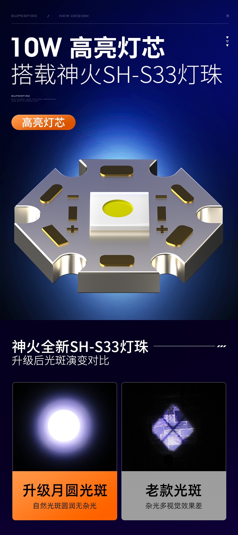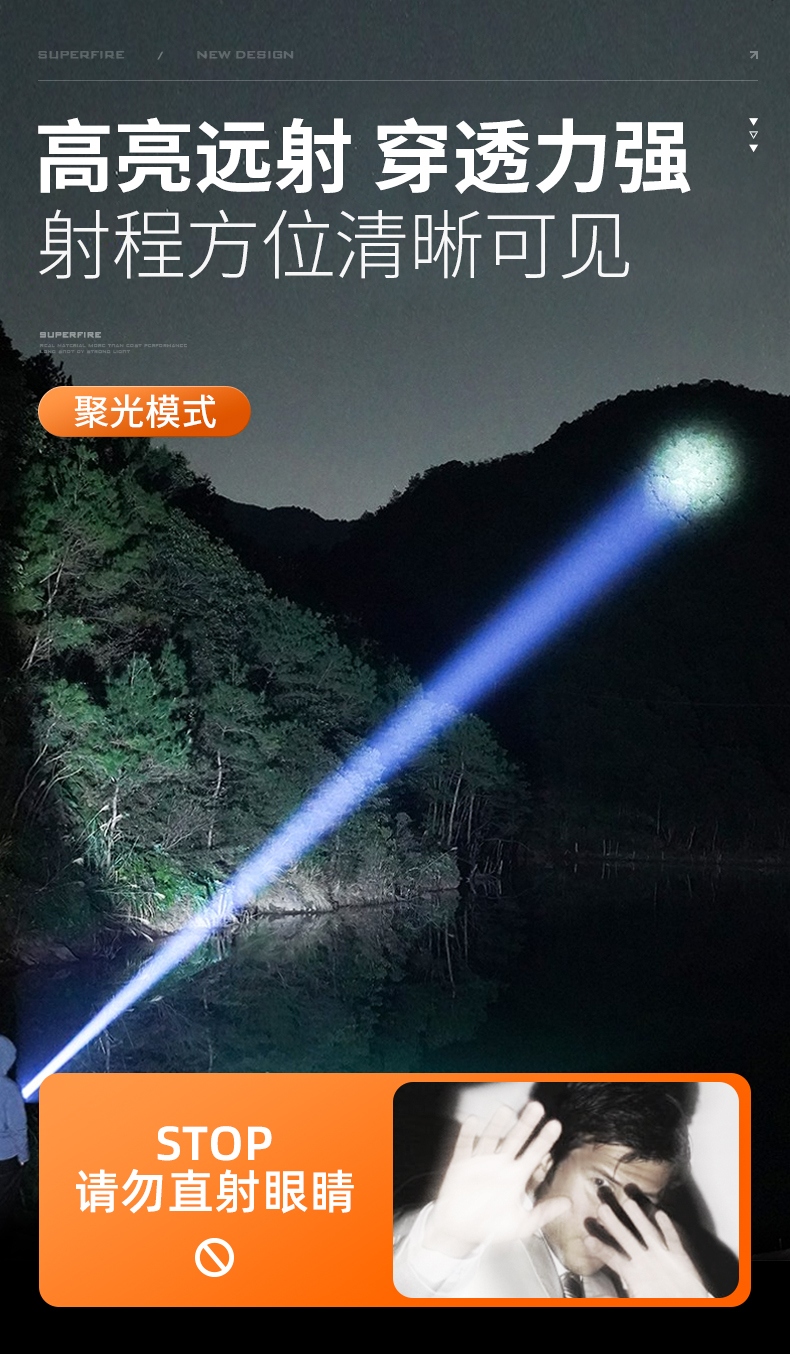1、千米远射,射程更远,光斑更聚焦。 2、进口灯珠,亮度高,照明效果更好。 3、前后双按键,光源一键点亮,高亮瞬间开启。