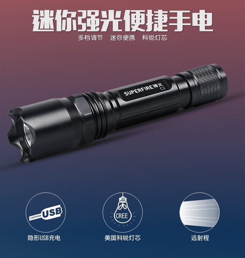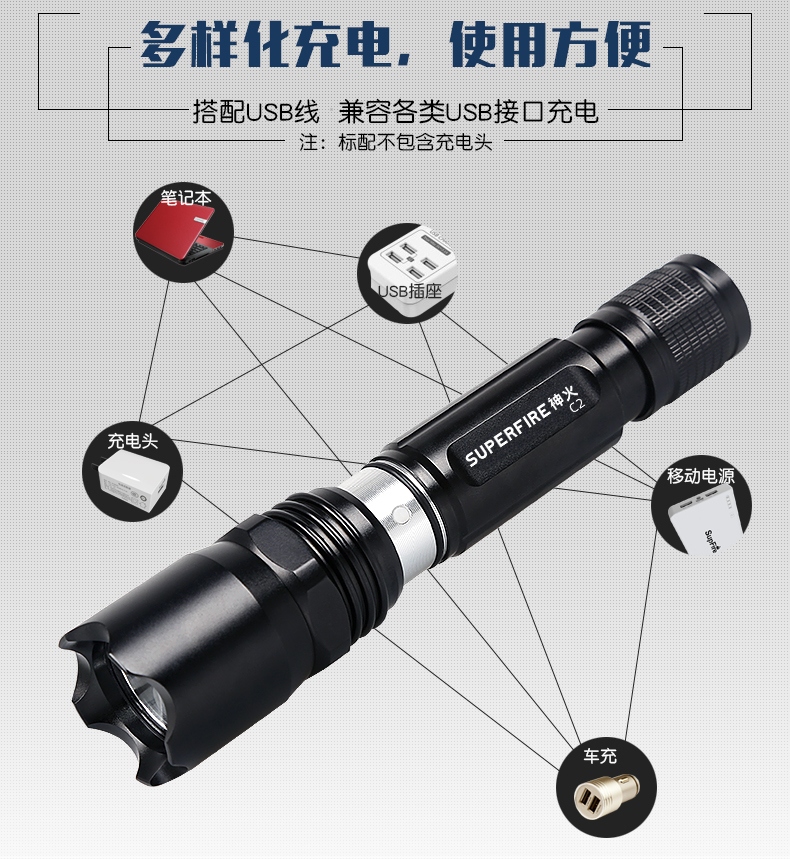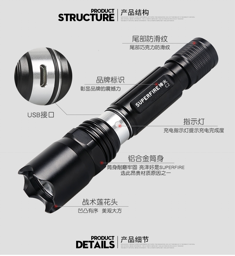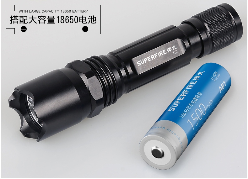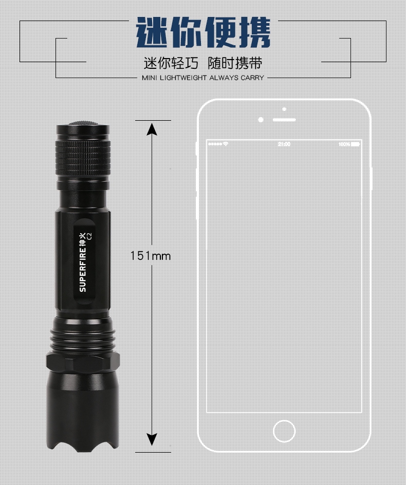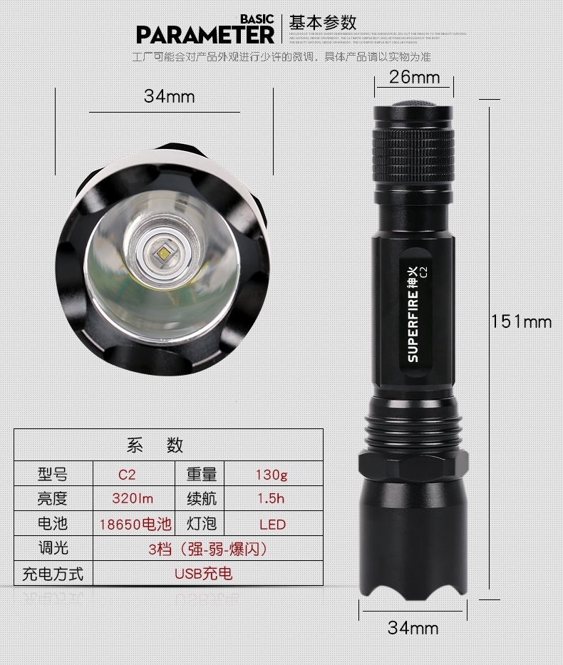 1、千米远射,射程更远,光斑更聚焦。 2、进口灯珠,亮度高,照明效果更好。 3、前后双按键,光源一键点亮,高亮瞬间开启。