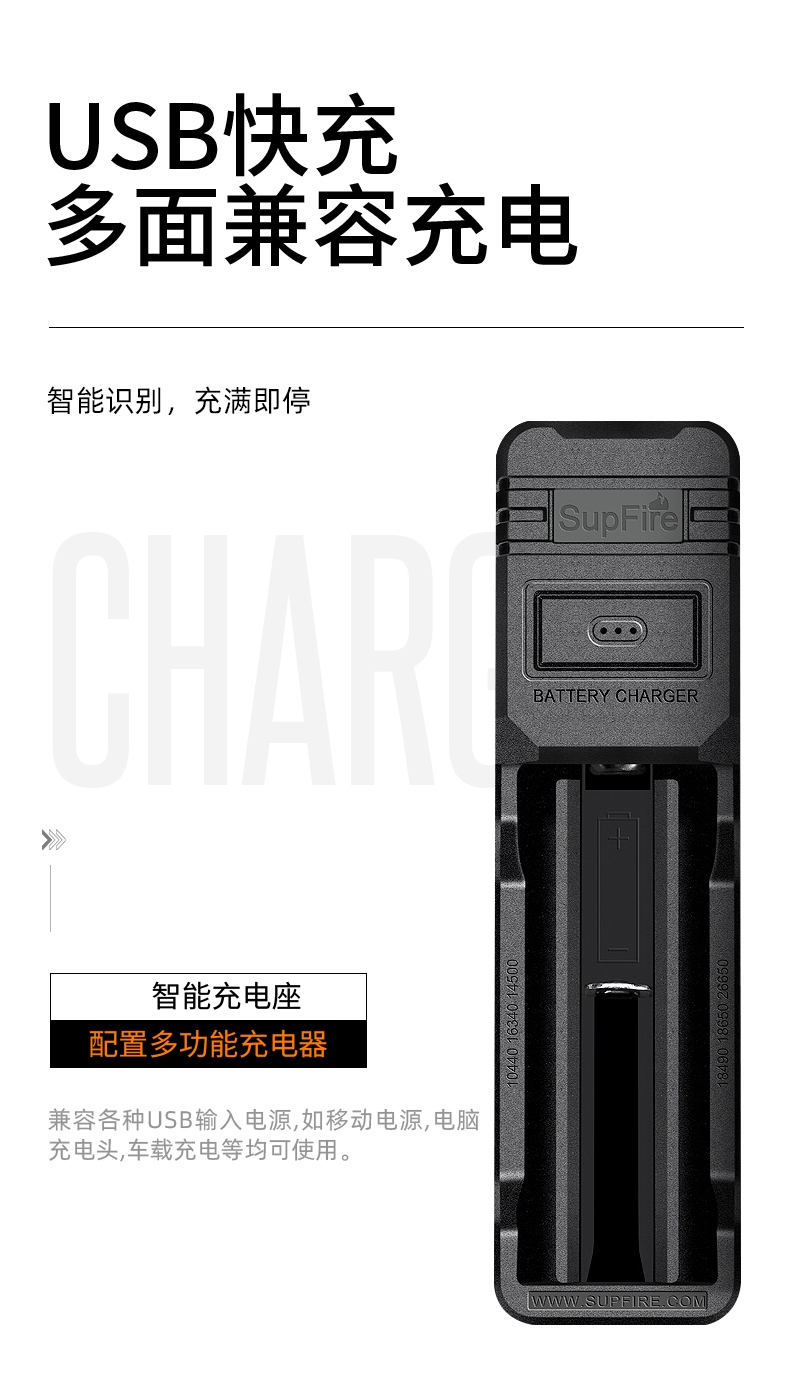 1.单击左边开关开启感应功能,同时开启强光档,续按关闭感应功能(关闭感应功能,光源不会关闭),当感应功能开启时,单击右边开关可正常调节档位。 2.多样化充电,使用方便:设有Type-c充电口,可使用充电器、充电宝、电脑等设备为灯具充电。 3.电量显示:实时