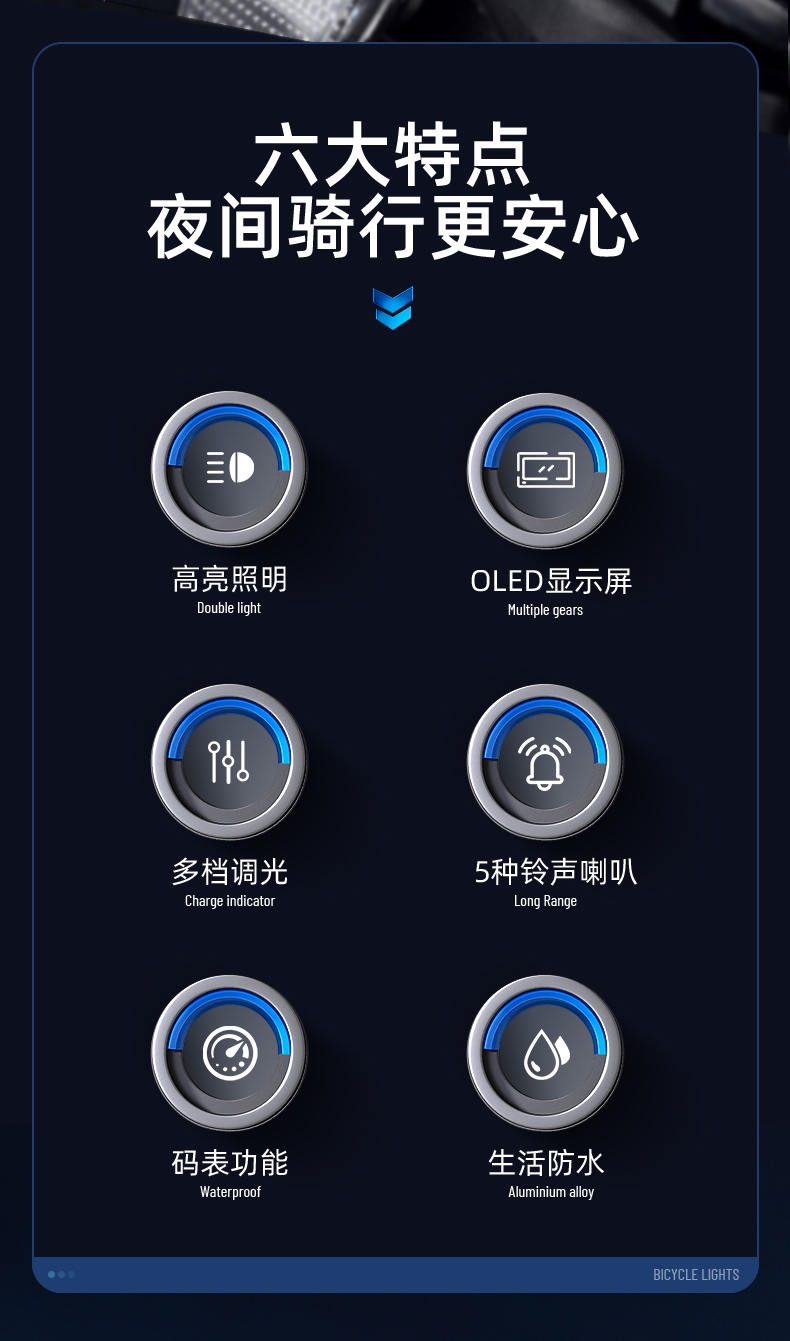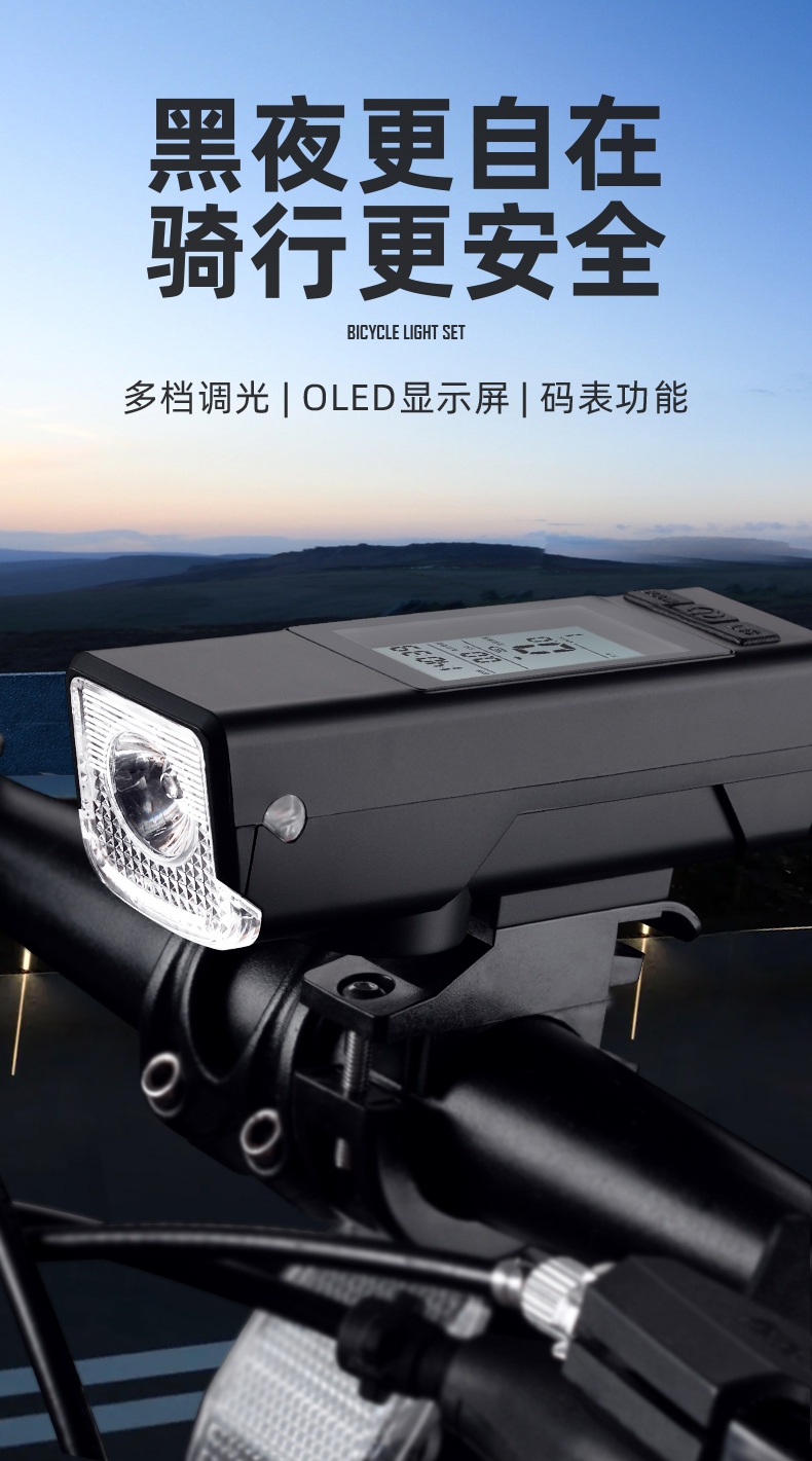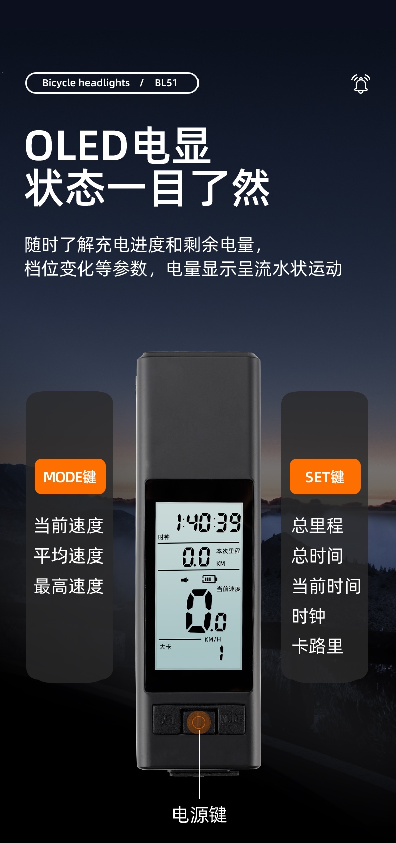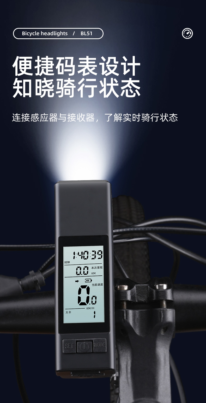 长按开关键开启/关闭码表,再按开启光源档位依次:强光-弱光-闪烁-关闭