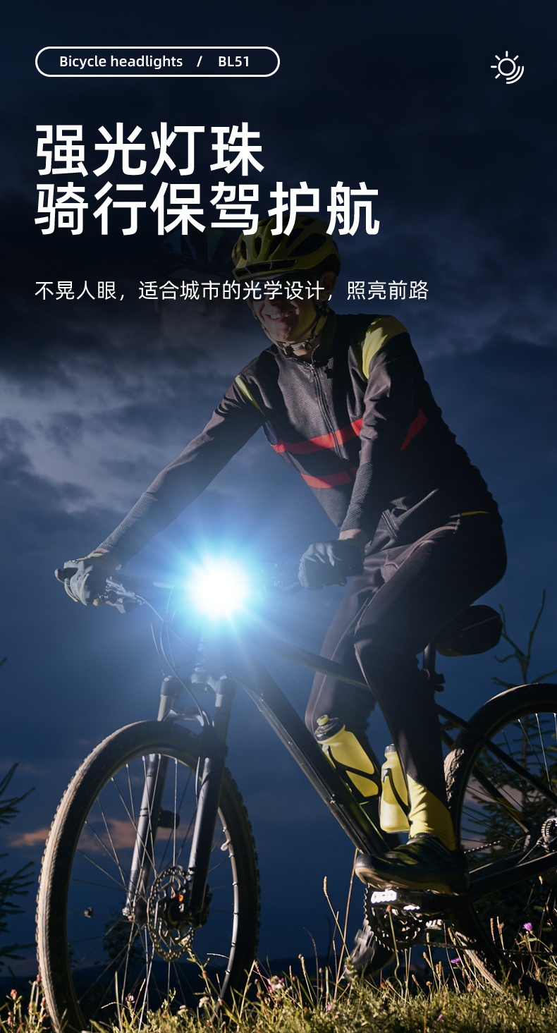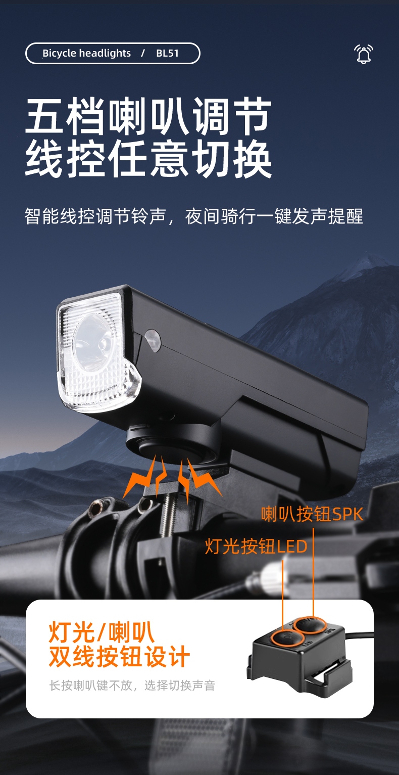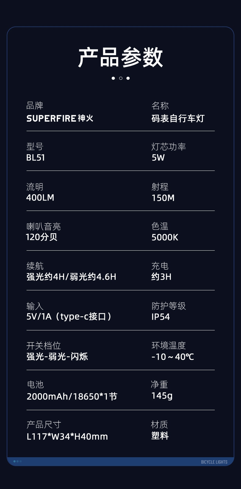 长按开关键开启/关闭码表,再按开启光源档位依次:强光-弱光-闪烁-关闭