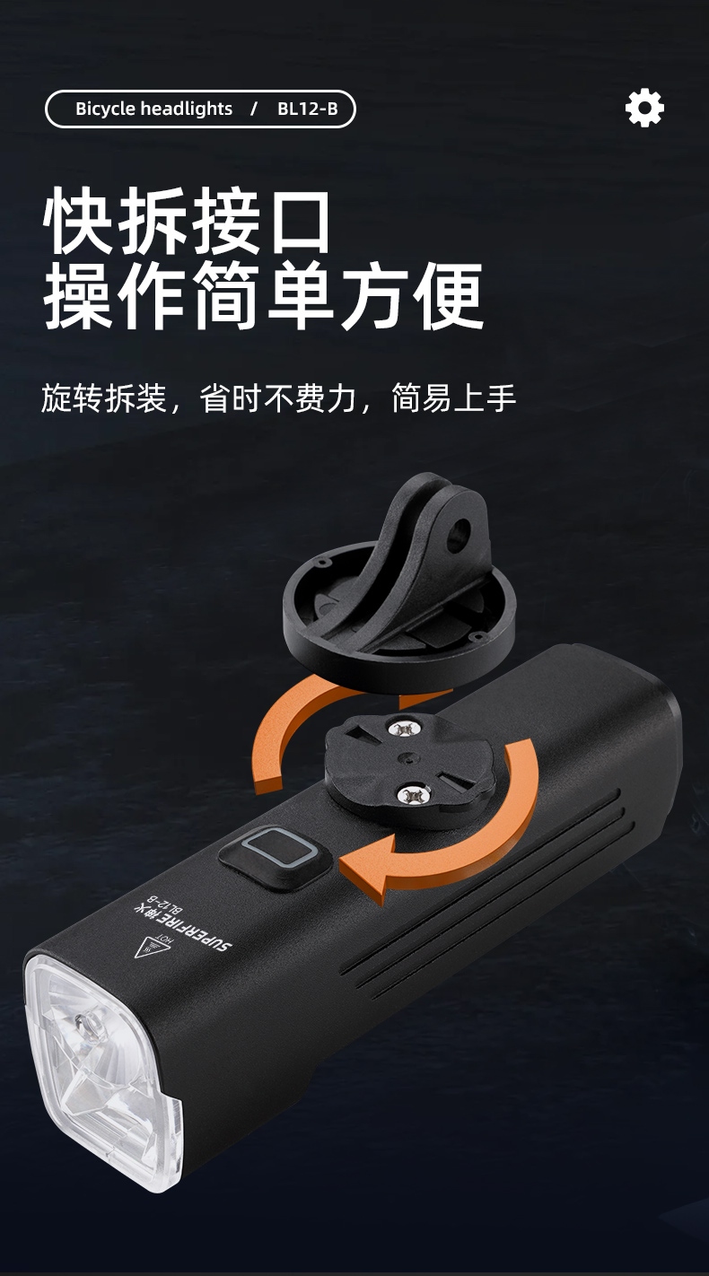 聚光主灯 亮度随心 轻按后端开关按钮,主灯强光点亮,续按依次切换主灯工作光-爆闪光。主灯开启状态下长按5秒,可实现光源色温转换。主灯关闭状态下长按5秒,可开启灯具最亮照明模式。 爆亮强光 亮如白昼 1500LM大功率高亮光源,点亮顷刻如白昼