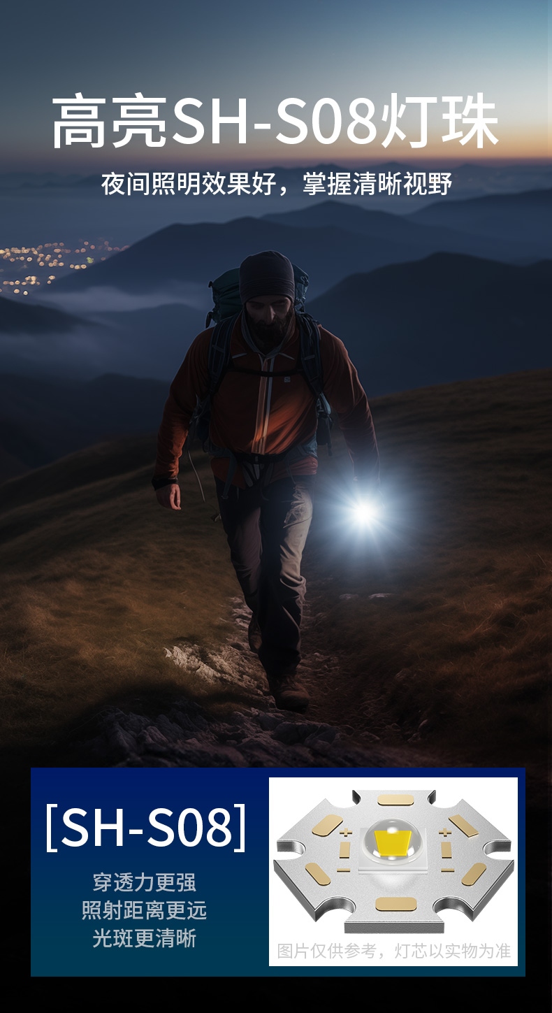 强光亮度,运动头灯,前后均衡设计,轻便不压头,可调节式头灯带,佩戴方便舒适,伸缩调焦,光照范围大,照射距离远,头灯角度调节,超90度角度随意调节,适宜各种环境使用