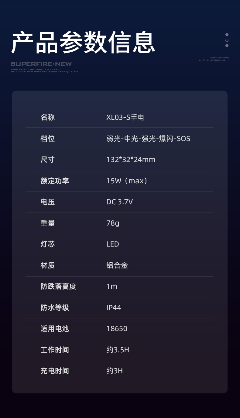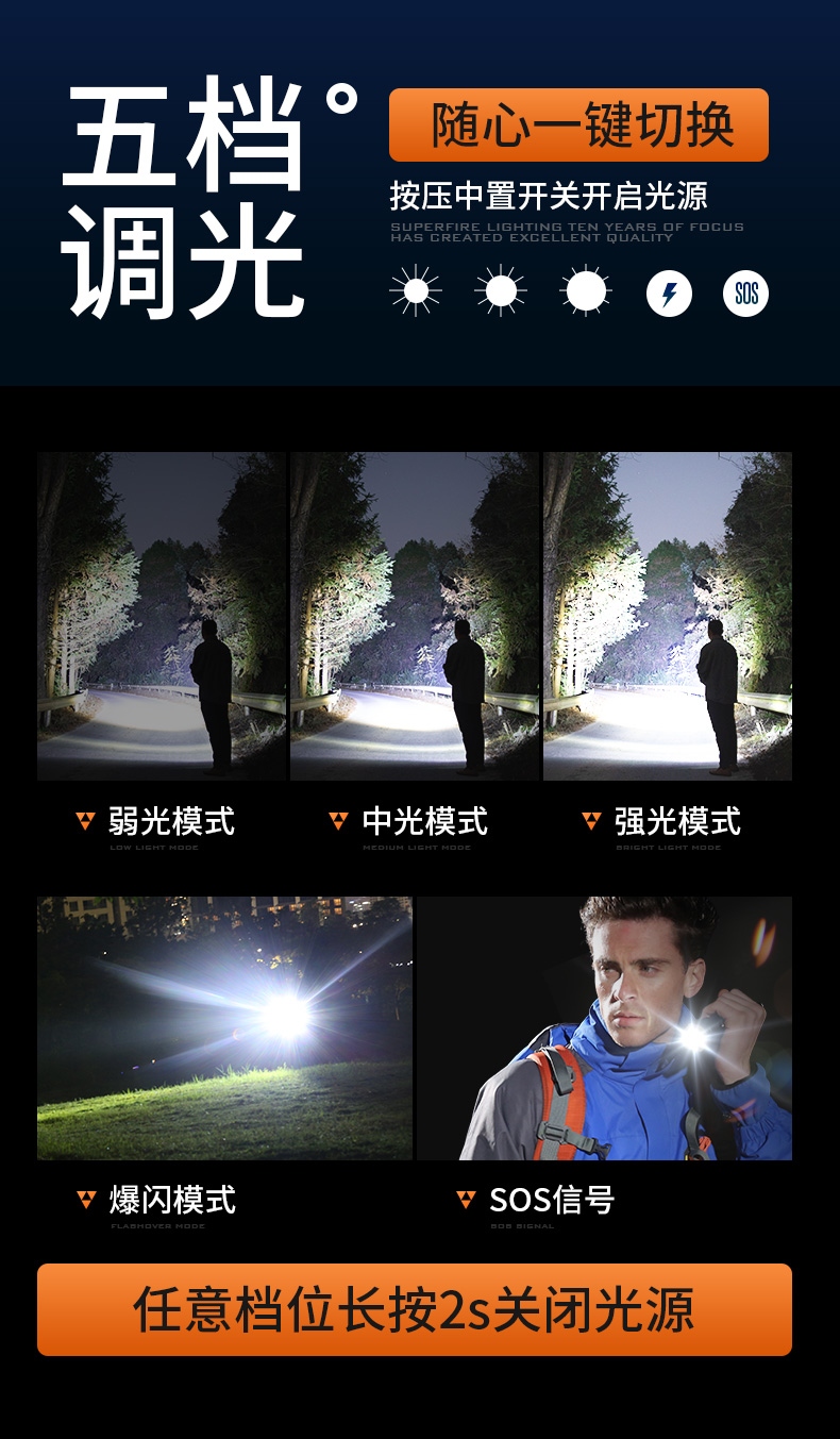 1、六档调光,可满足不同使用场景下的照明需求。 2、进口高亮朗明纳斯灯珠,照明效果更好。 3、含档位记忆,任意档位快捷关机 ,开机恢复关机前档位。