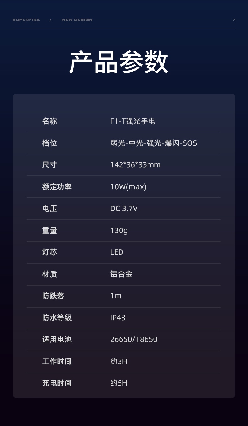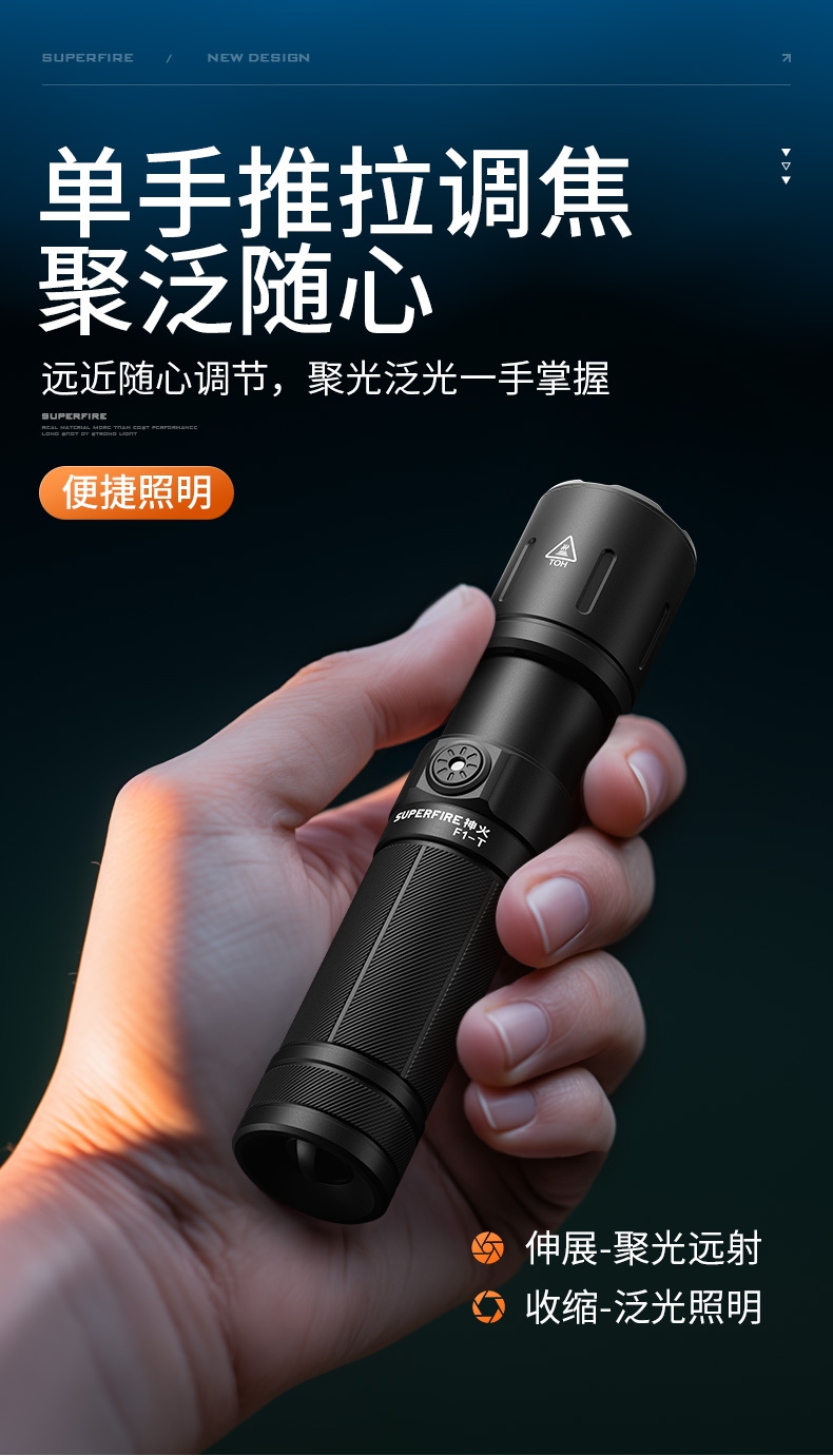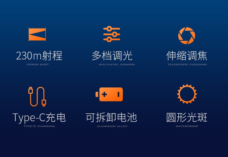1、圆形光斑, 照明效果更好,光斑更圆润。 2、五档调光,可满足不同环境下的照明需求。 3、伸缩调焦,远近视野一手掌控。